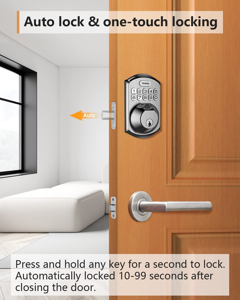 Smart-Locking: 'Automatic door lock' can be set to lock automatically in 10-99s; 'one-touch auto-lock' can press and hold any key on keypad for 2 seconds to lock the door.
