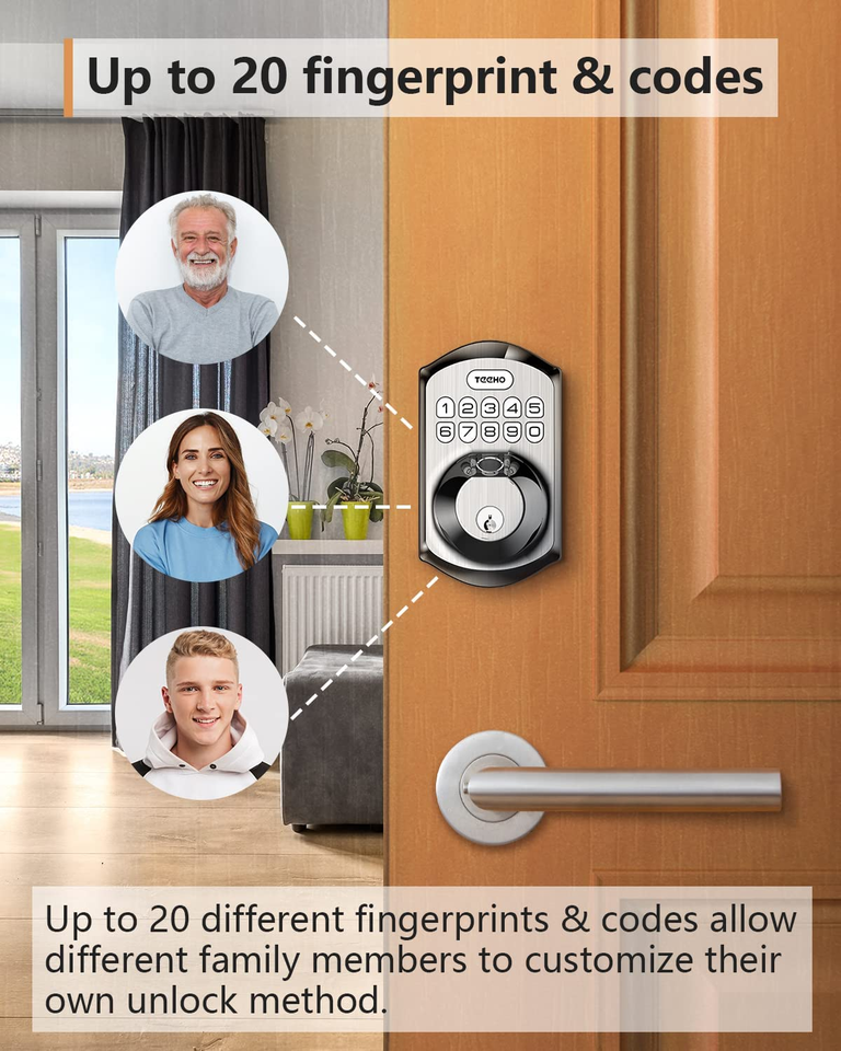 Keyless Entry: This keypad lock provides 20 access codes and fingerprint for family use and an available temporary code for the single guest entry.
