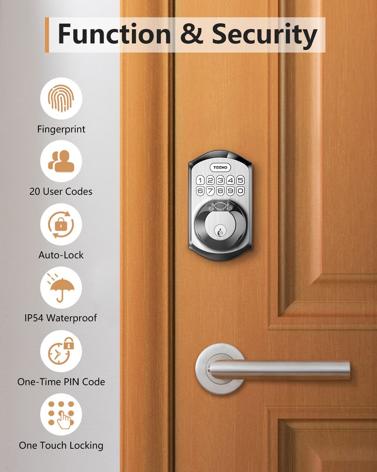 Fingerprint unlock: Biometric Fingerprint Identification - It recognize your fingerprint in just 0.3 seconds, and unlock your door in 1 second.