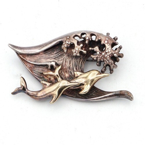 Taxco Mexico TC-67 Sterling Silver Two Tone Dolphin Jumping Hoop Brooch Pin