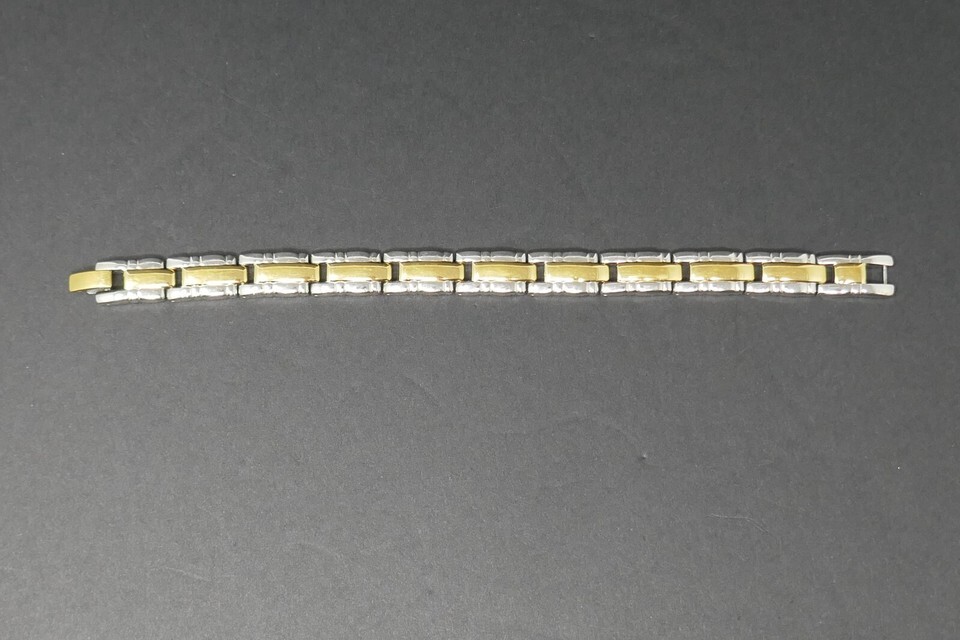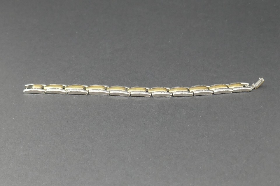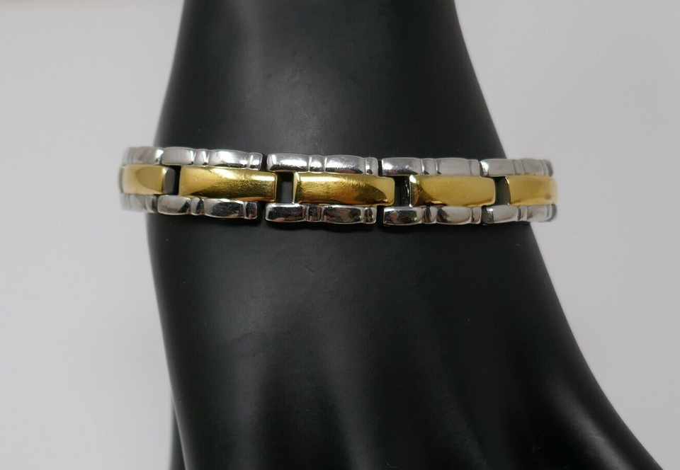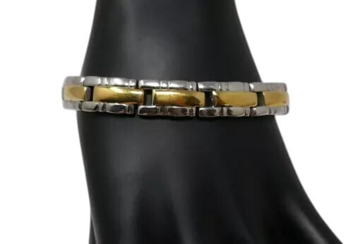 Elevate your accessory collection with the 24K gold-plated rectangle panel link bracelet. This stunning piece showcases a chic two-tone design, seamlessly blending sophistication with a touch of vintage allure. Its 7-inch length ensures a comfortable fit, making it an ideal choice for both casual and formal occasions.