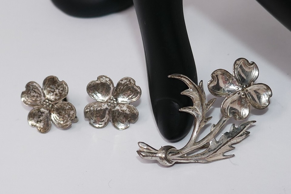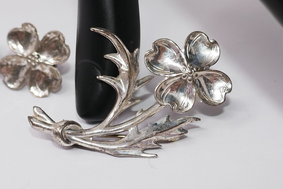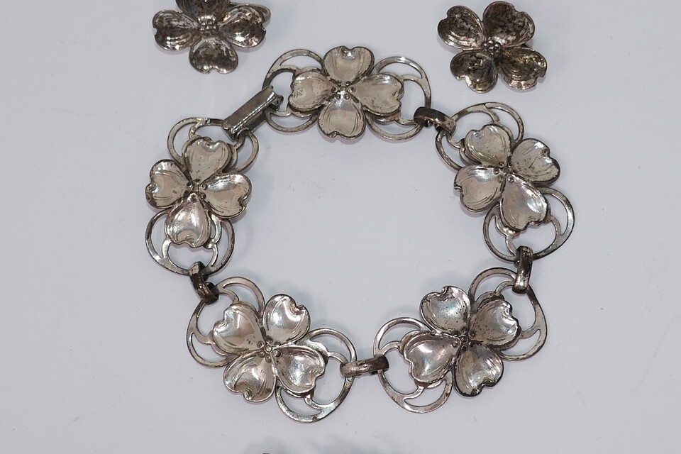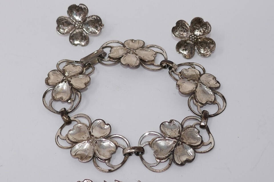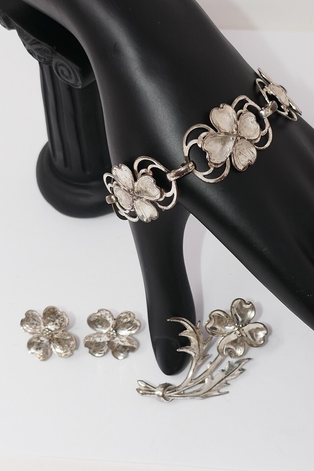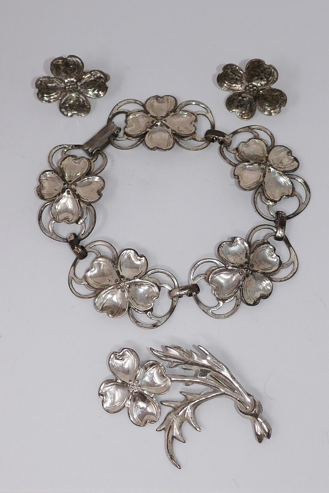 Lang 1940s Sterling Silver Dogwood Flower Bracelet Earrings Brooch Pin Set