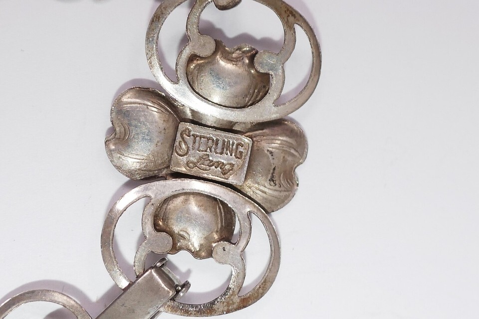 Up for sale is a Lang 1940s Sterling Silver Dogwood Flower Bracelet Earrings Brooch Pin Set. All are marked Sterling with only the bracelet stamped Lang. The bracelet measures approx. 7" long, the earrings 1" long and the pin 2" long. These weigh 19.72g in total.
