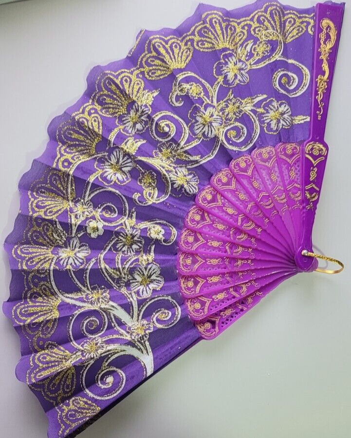 Gold & Purple Large Lace Floral Folding Hand Held Plastic Chinese Fan