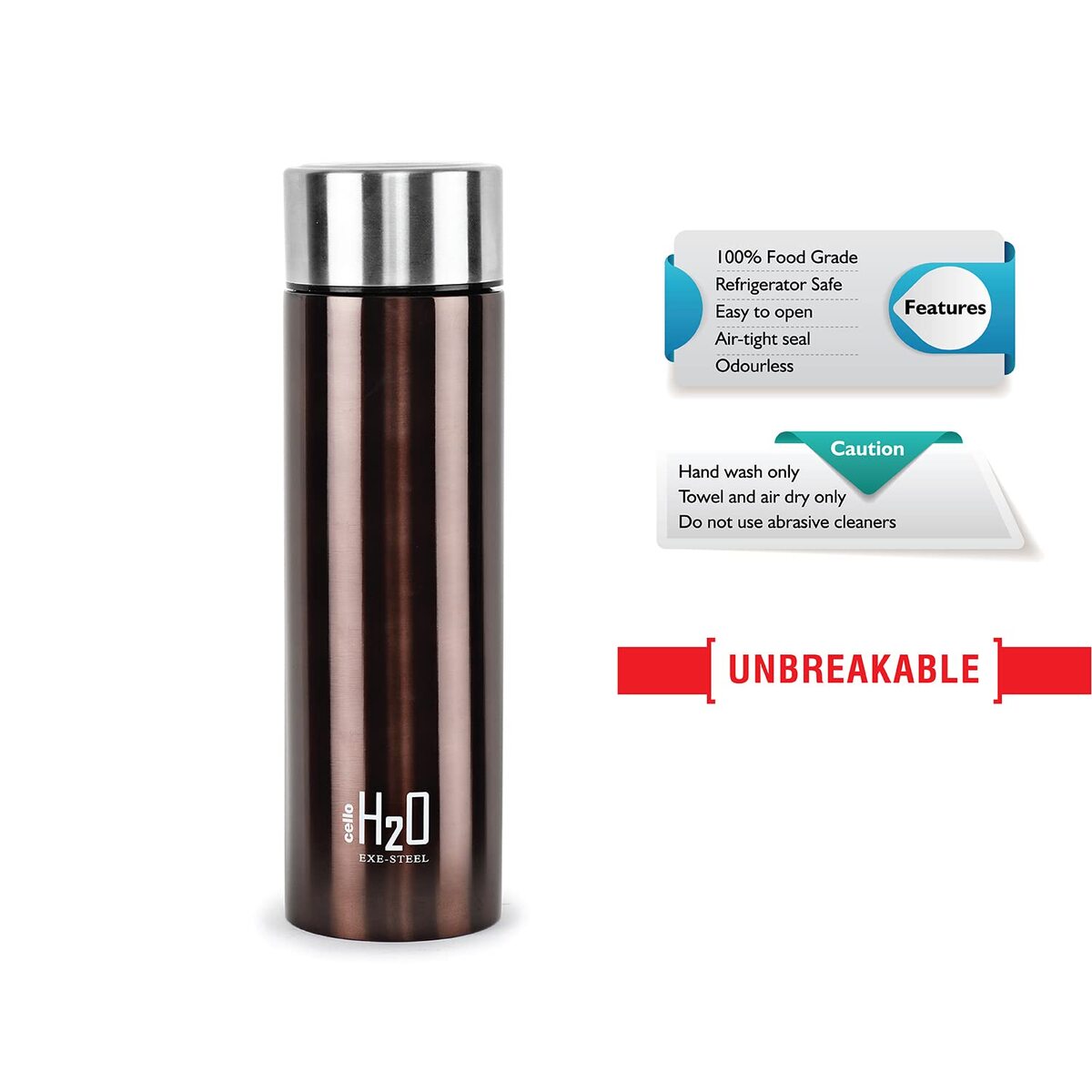 Cello H2O Stainless Steel Water Bottle, 1 Litre, Brown |