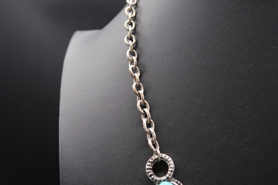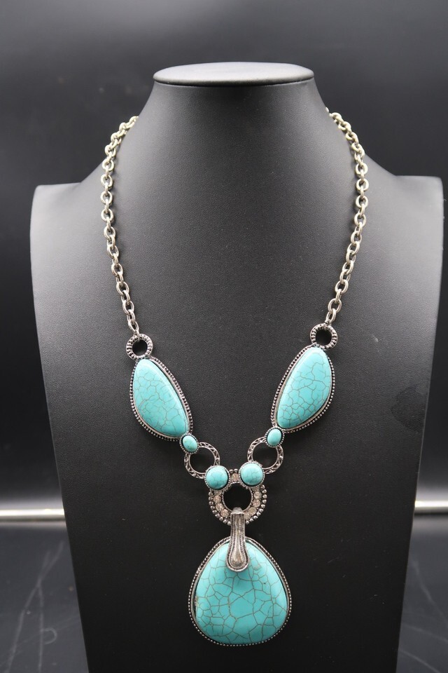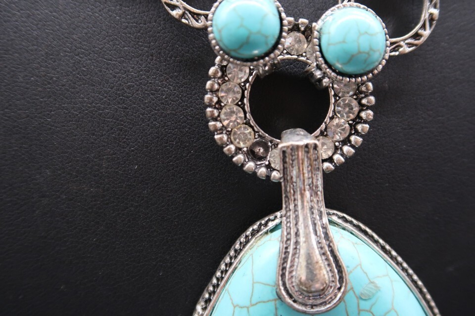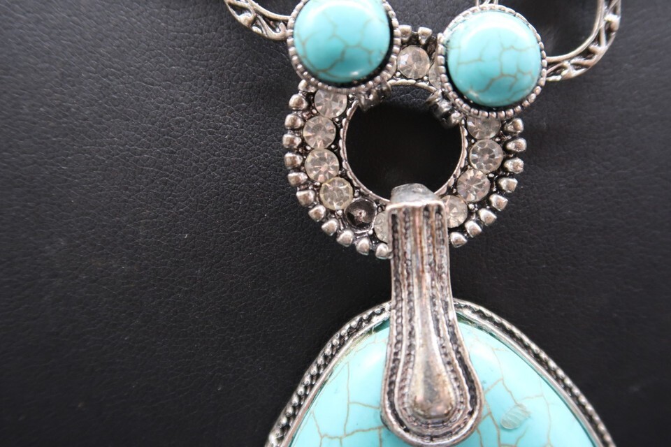 Vintage Statement Pendant Necklace Silver Tone Faux Turquoise Rhinestone 24"