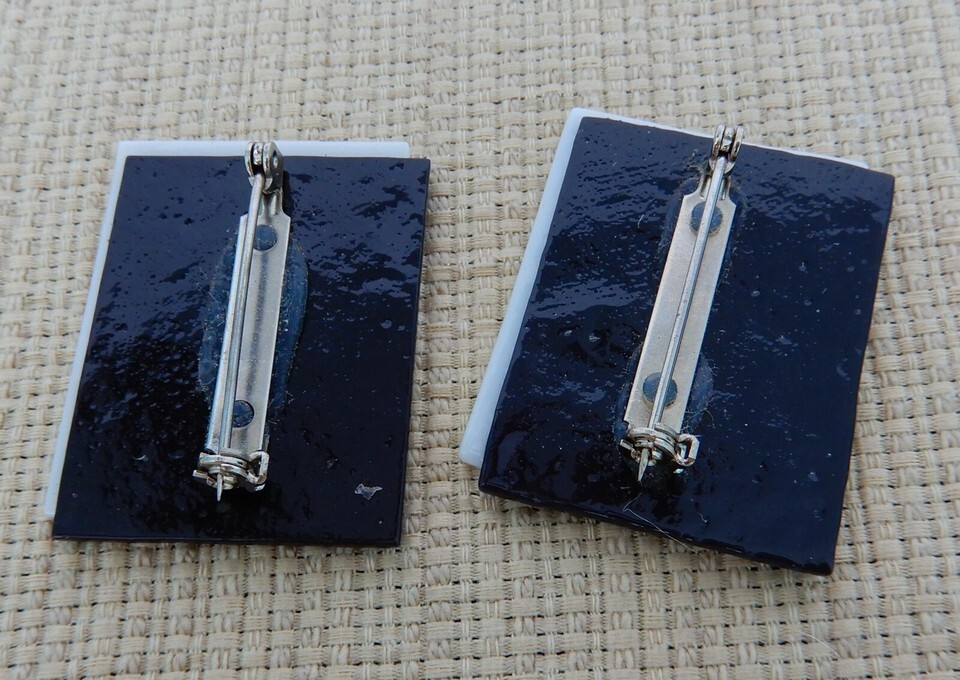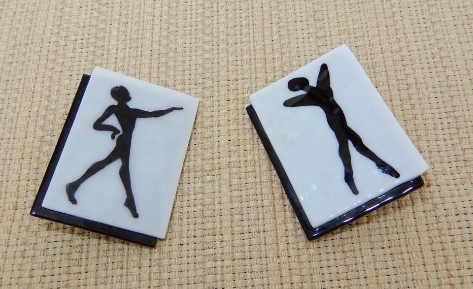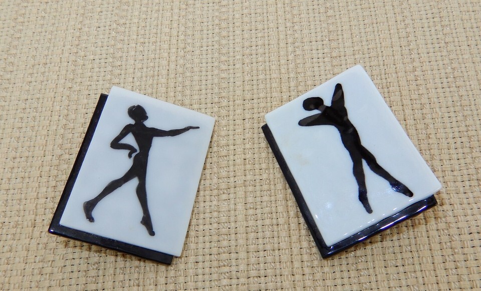 Vtg pair fused art glass rectangular black & white dancing silhouette brooches