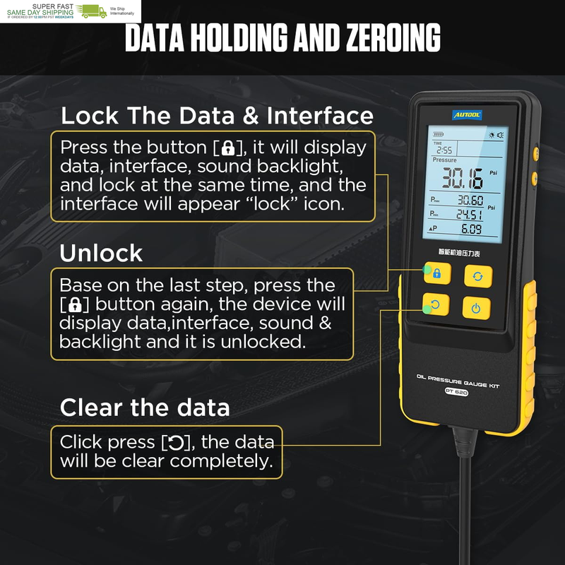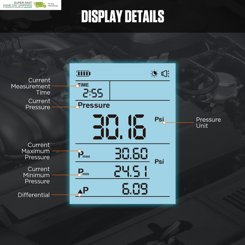 ?Accurate Measurement?Digital compression gauge has incredible Pressure Resolution: 0.01 psi / 0.01 bar / 0.01 kg/cm,display resolution within 0.2% of the exact pressure ranged from 0-426.6PSI; 0-29.4BAR; 0-30KG/CM