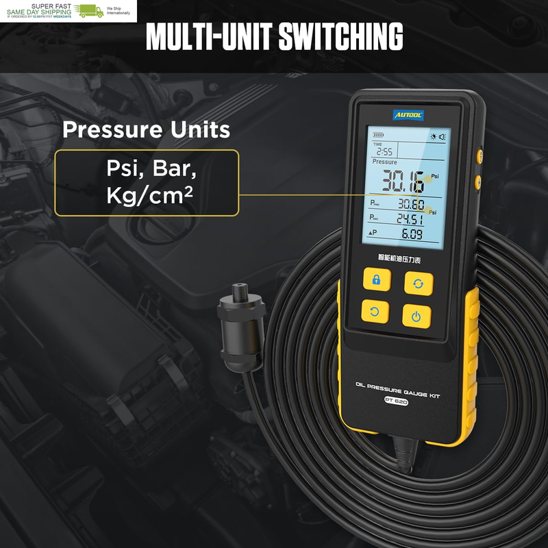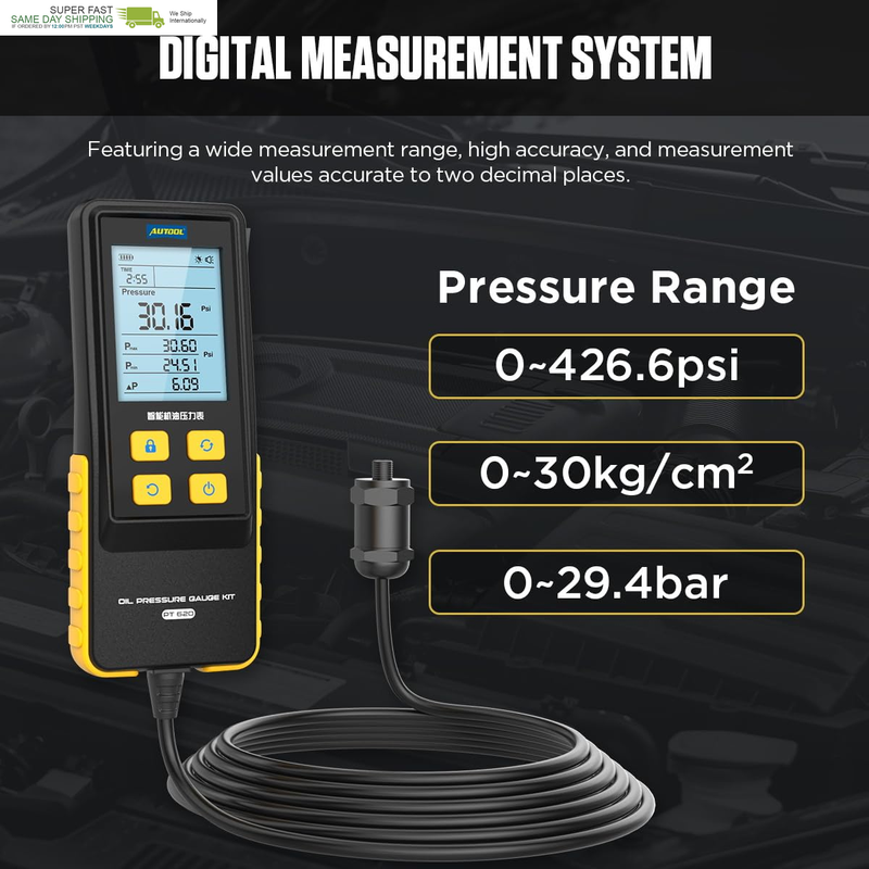 Pressure unit can be switched between PSI, bar, kg/cm,measurement range 426.6PSI, 29.4bar, 30kg/cm