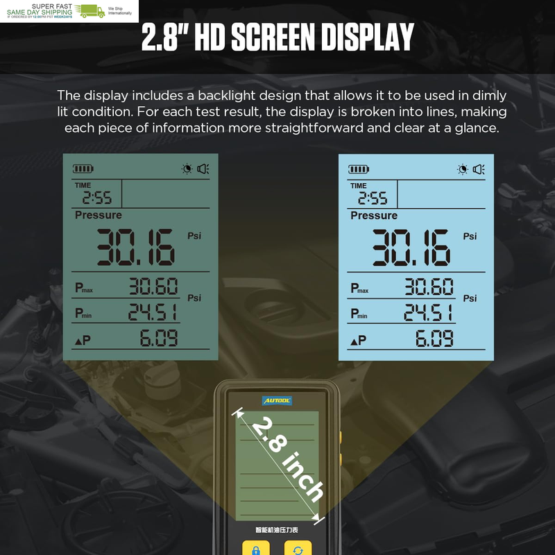 ?Smart Display?The 2.8-inch backlit display shows clear,The display includes a backlight design that allows it to be used in dimlylit condition. Multi-group test results are shown as Current pressure,Current maximum pressure,Current minimum pressure,Differential,Current measurement time,Pressure units