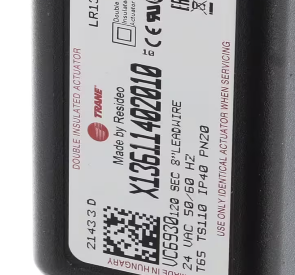 Trane VC6930ZZ32, X13611402010 Modulating Actuator is a genuine OEM Trane actuator designed for precise control of valve positioning in compatible HVAC systems. Operating on 24 volts with 50/60HZ compatibility, this modulating actuator delivers accurate, smooth modulation to maintain optimal system performance and control. Equipped with an 8-inch lead wire, it is manufactured to Trane?s exact specifications and intended as a direct replacement for the factory-installed actuator.