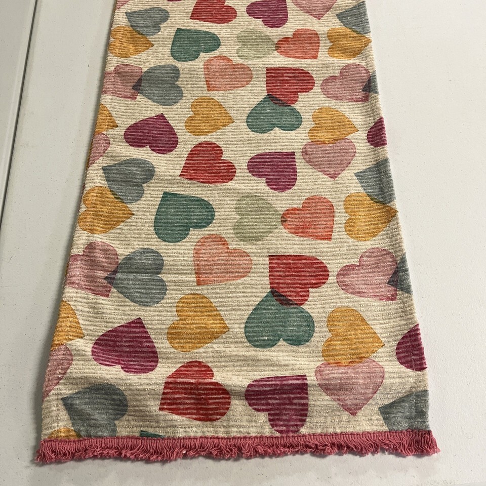 Cupcakes & Cashmere Table Runner Textured Colorful Heart Print Pink Fringe 16x90