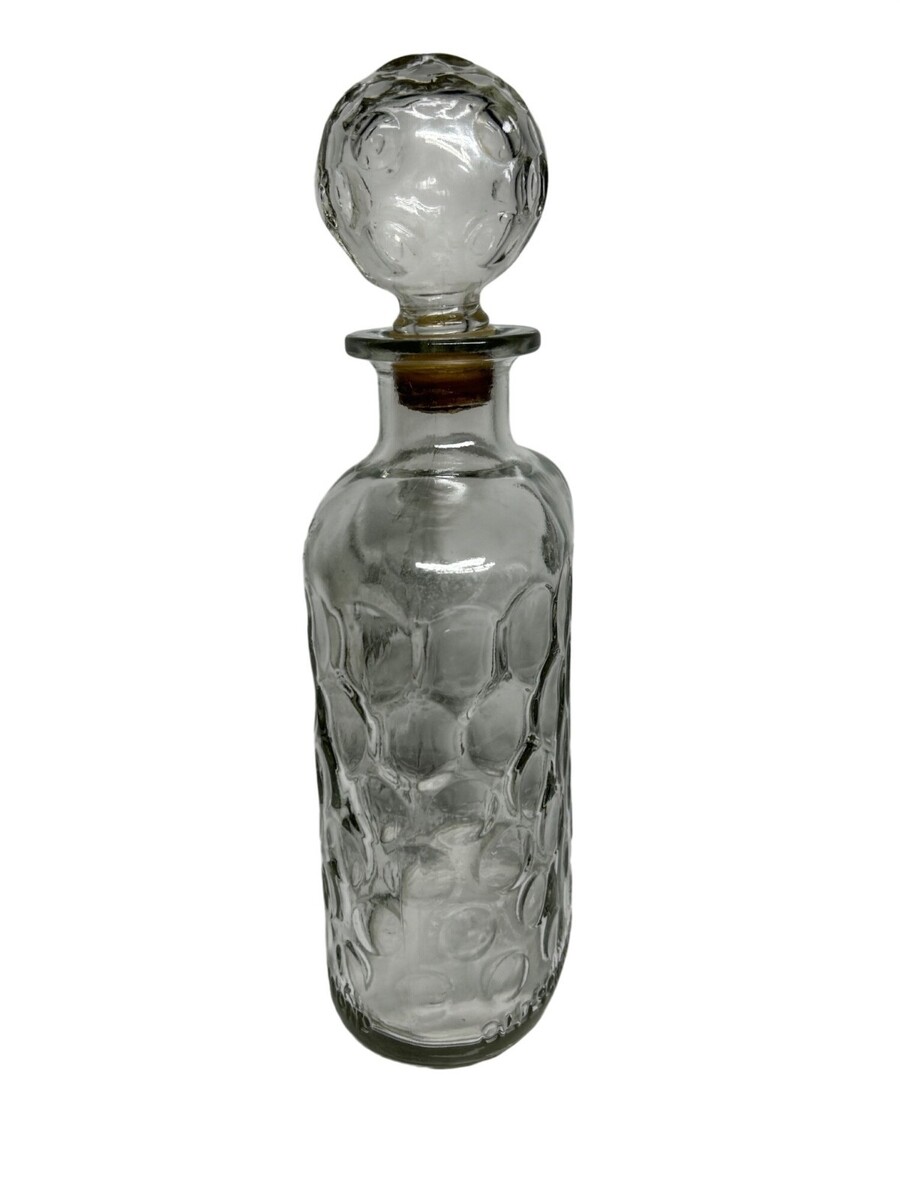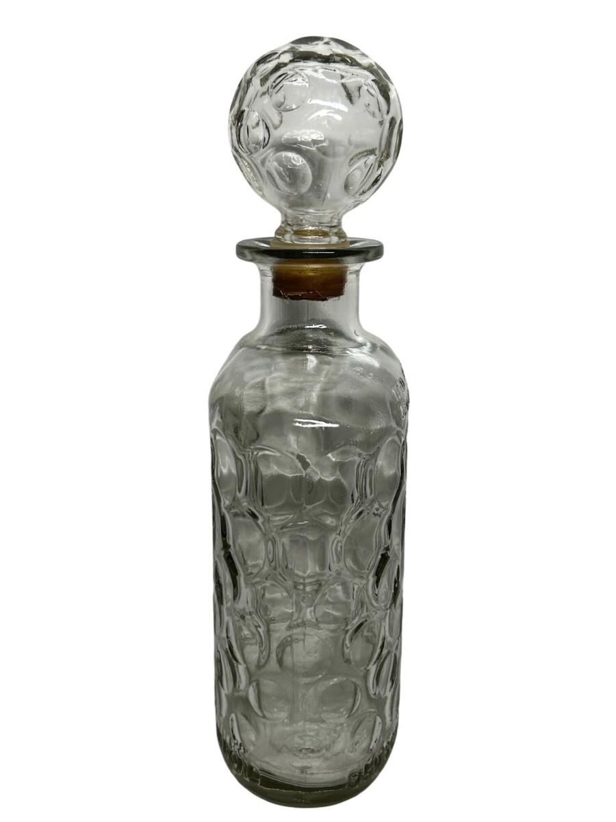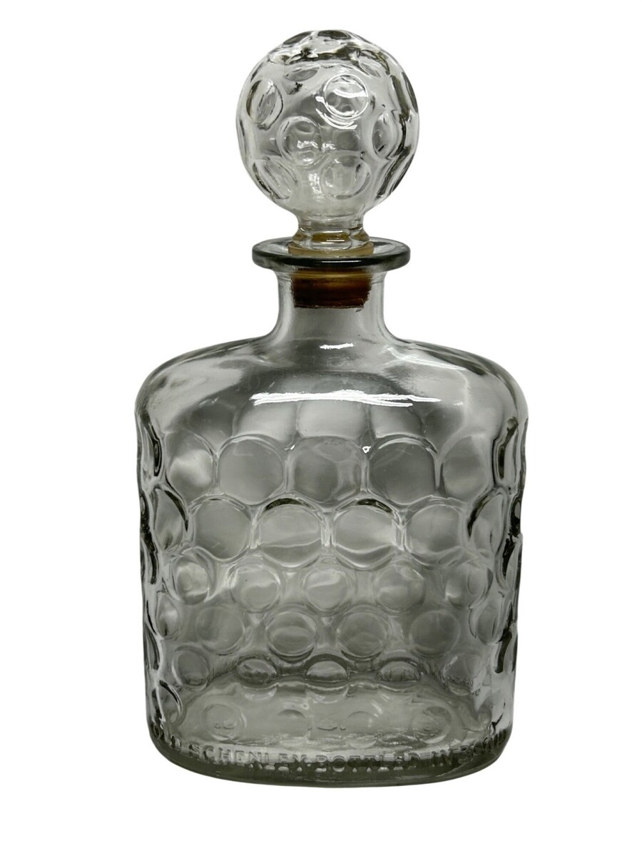 This bottle decanter made by Anchor Hocking for Old Schenley. This clear thick glass is made in a large hobnail - like pattern that catches light like scattered gems. Its round ball stopper still has cork attached.