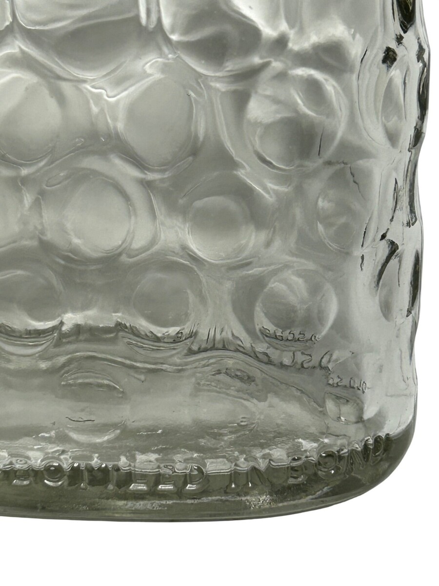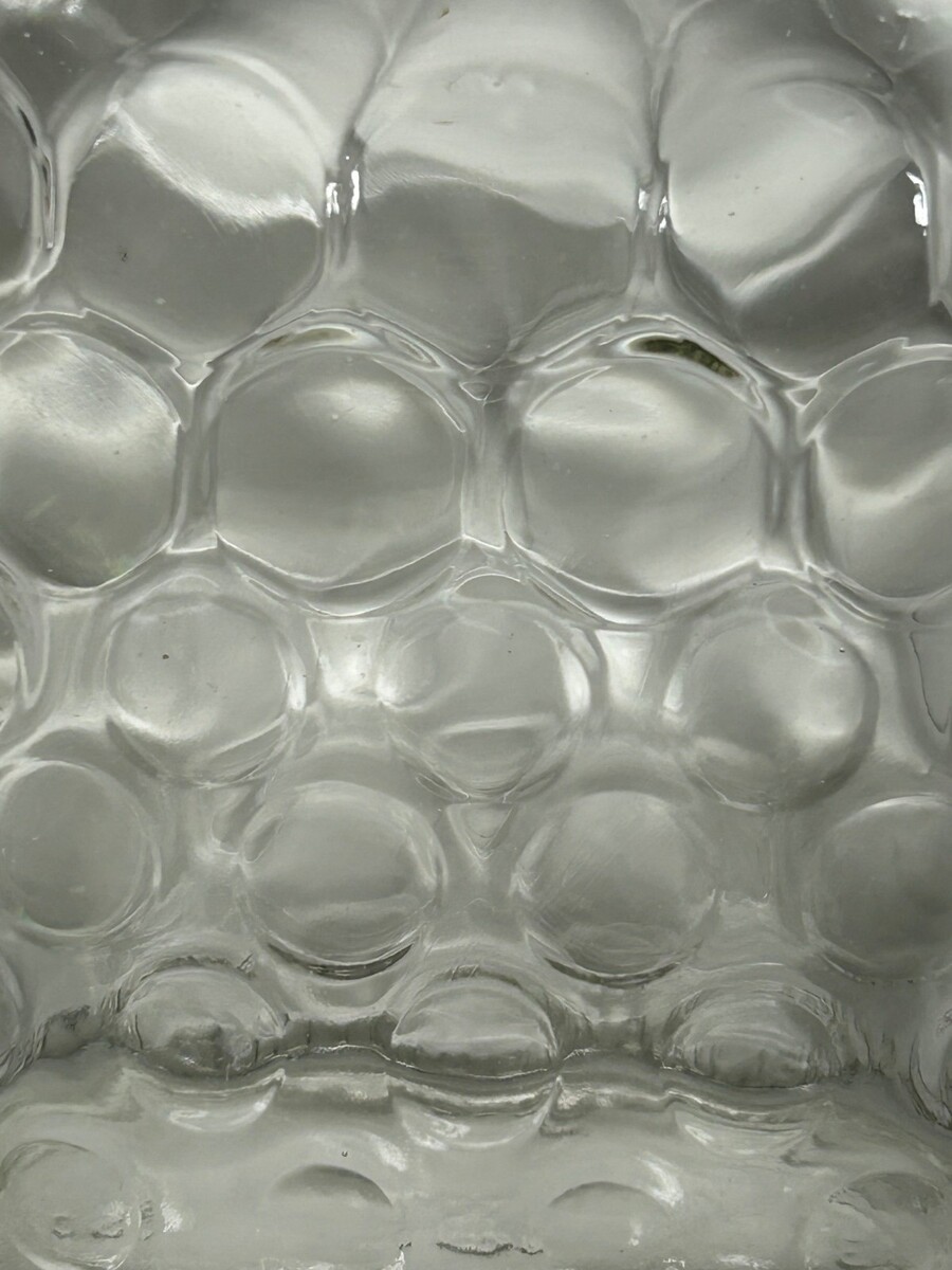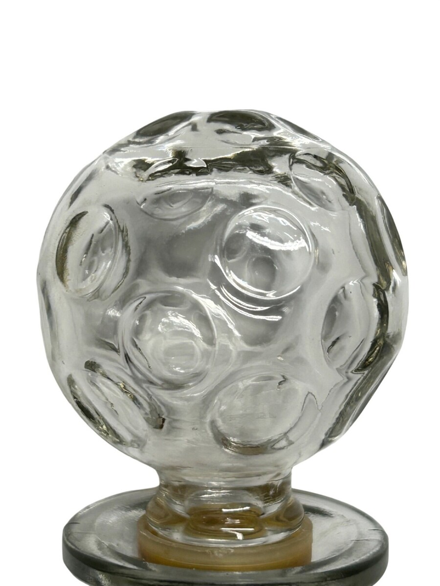 This bottle decanter made by Anchor Hocking for Old Schenley. This clear thick glass is made in a large hobnail - like pattern that catches light like scattered gems. Its round ball stopper still has cork attached.