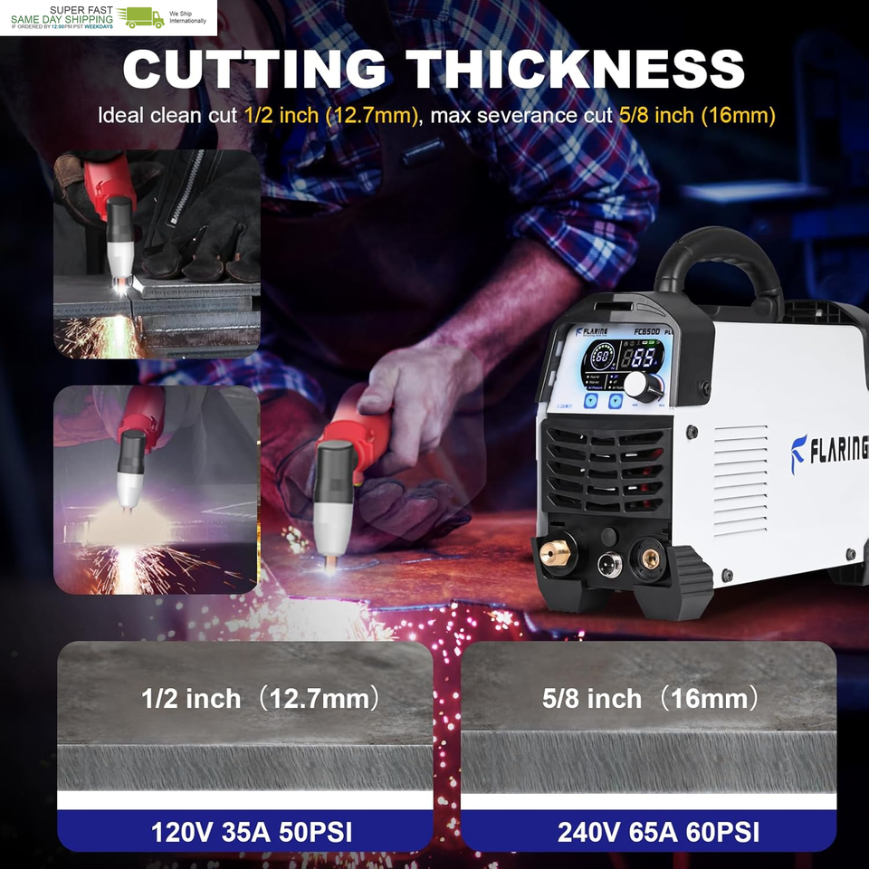 POWERFUL CUTTING PERFORMANCE: 60/65Hz high-frequency IGBT inverter, 120V/240V dual voltage. The maximum current can reach 35A at 120V and 65A at 240V. 1/2"(12mm) clean cut at 35A 120V 50PSI, 5/8"(16mm) severance cut at 60A 240V 60 PSI. Recommended breaker size: 40A at 240V, 55A at 120V. Air compressor required: 90 PSI, 60 L/min or above