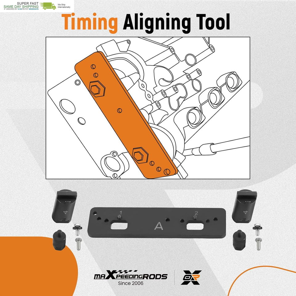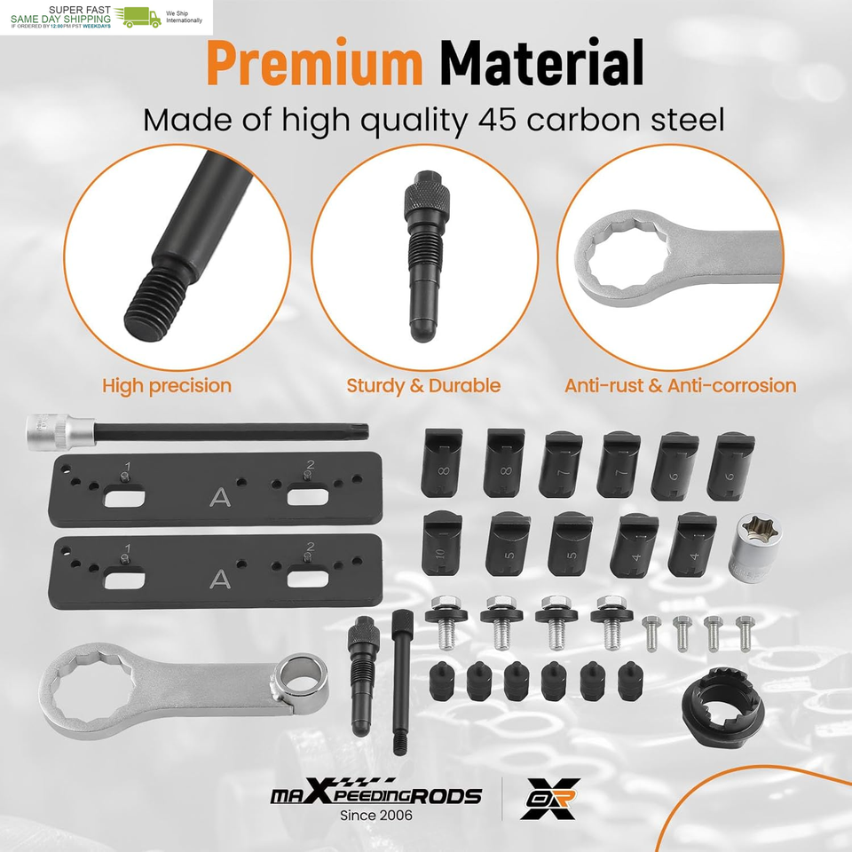 Package Included: Camshaft aligning tool t40331(23 pcs), wrench t90002*1, screw extraction bit t40382*1, e24 socket camshaft sprocket adjust tool*2, crankshaft locking pin*1, crankshaft and balancer shaft fixing pin*1