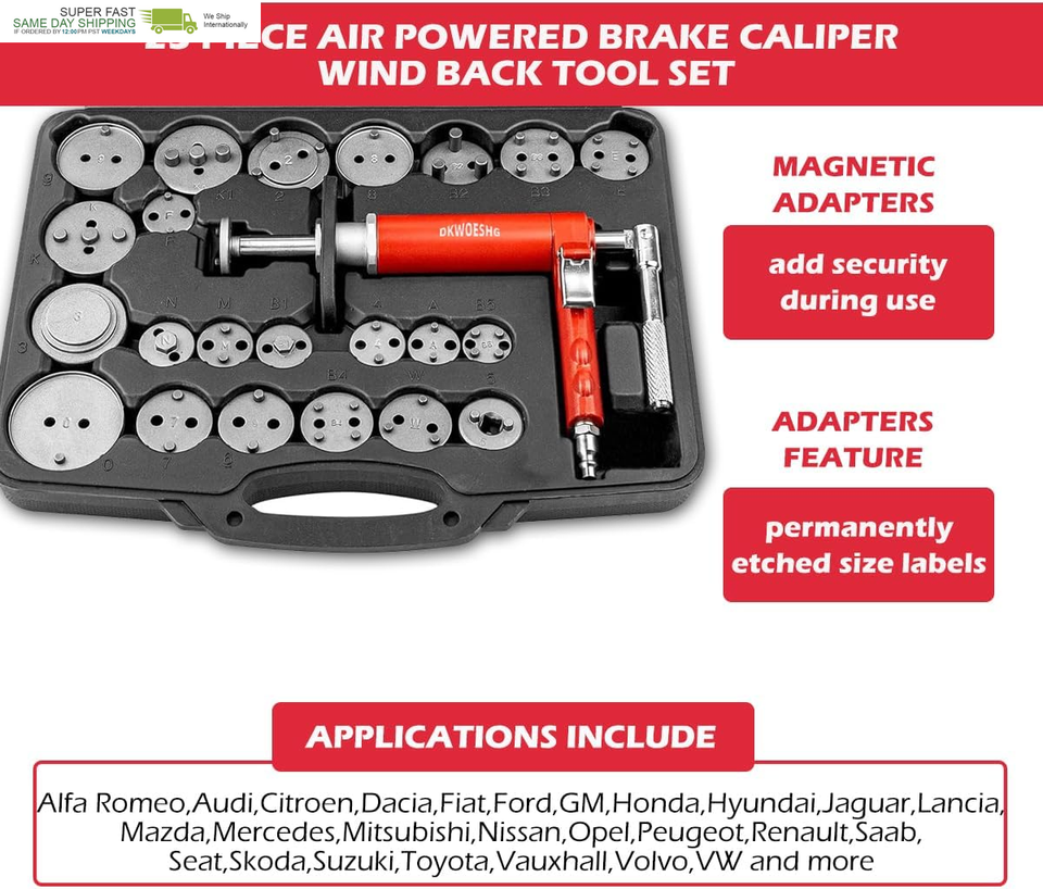 Pneumatic Brake Caliper Compression Tool Kit, Air Operated Disc Brake Piston Wind Back Rewind Tool Set for Automotive Maintenance and Repair