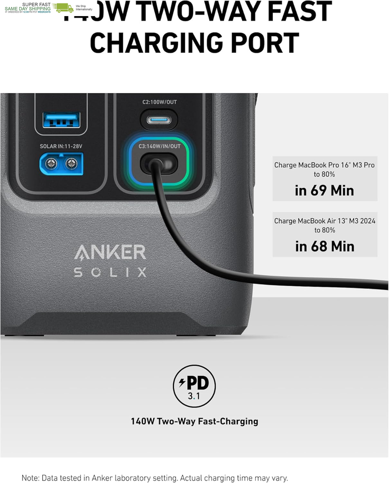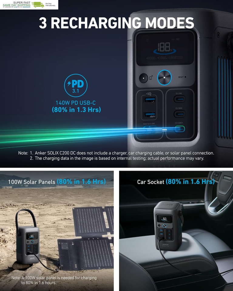 3 Ways to Recharge: Fast recharge to 80% in 1.3 hours with the 140W USB-C PD 3.1 port. You can also use solar panels or your car. The solar panels are not included.