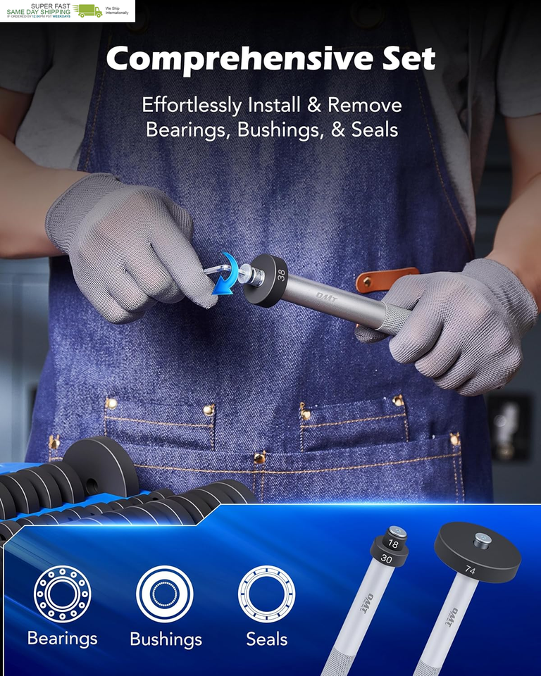 COMPLETE SET: The discs sizes range from 18mm (0.7 inches) all the way to 65mm (2.51 inches) in 1mm increments plus 74mm (2.91 inches). All discs are connected with a 12mm (0.47 inches) shaft and screw which quickly connects to a 180mm (7.08 inch) handle, making for a complete and effective wheel bearing driver set.