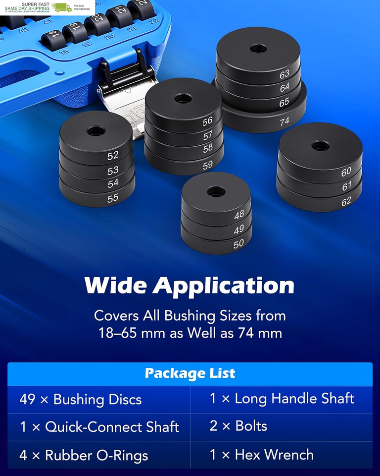 UNIVERSAL SIZING: This Orion Motor Tech bushing removal tool kit includes 50 interchangeable discs to build 2,450 custom bushing driver variations so you always have the right size for the job.