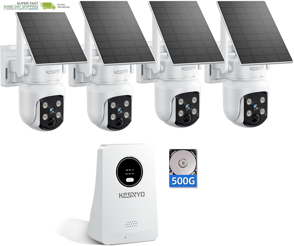 4MP Solar Powered, 4 Cam Kit, Color Night Vision, 360 PTZ, 500G HDD Local Recording, No Monthly Fees