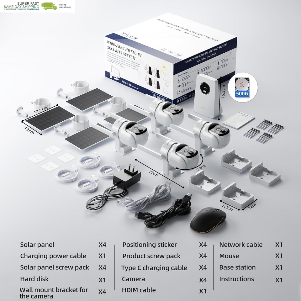 4-in-1 Base Station Kit: The KCSNYO base station kit with 1 base station and 4 outdoor solar powered cameras, base station with 500GB HDD capable of storing up to 12 months of cyclic recordings. The system can be expanded to support up to 10 cameras. All data is securely encrypted and stored locally, ensuring privacy and convenient access. The base station allows video output to a monitor, enabling flexible control via a mouse.