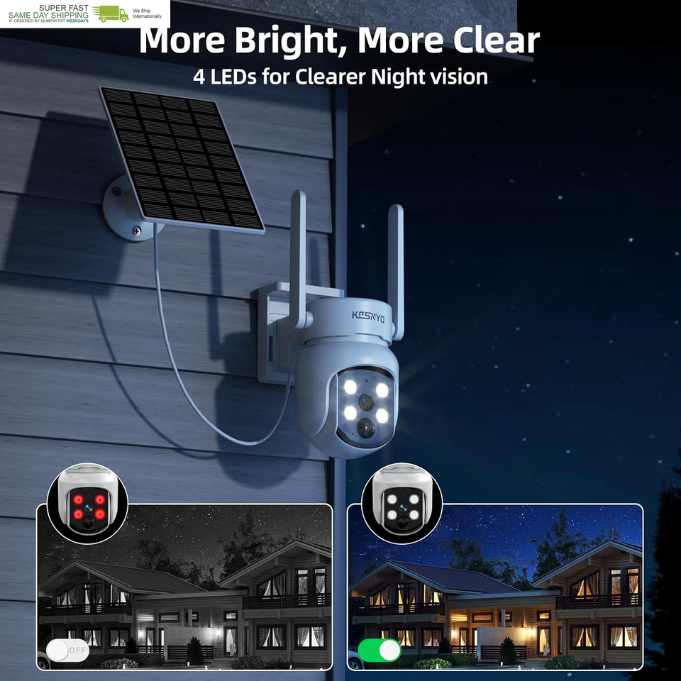 ??? ??? ???????? ??????? ??? ????????? ????? ????? ??????: The solar-powered security cameras wireless outdoor features 4MP QHD resolution, capturing every moment with crystal-clear 2.5K clarity both day and night. Its advanced starlight sensor provides bright, color video even in low-light conditions, ensuring that no detail is overlooked. Equipped with four LEDs and spotlight capabilities, the solar camera outdoor wireless enhances visibility during nighttime surveillance.