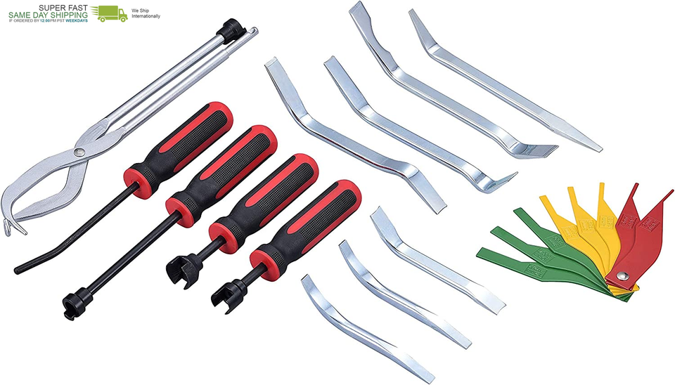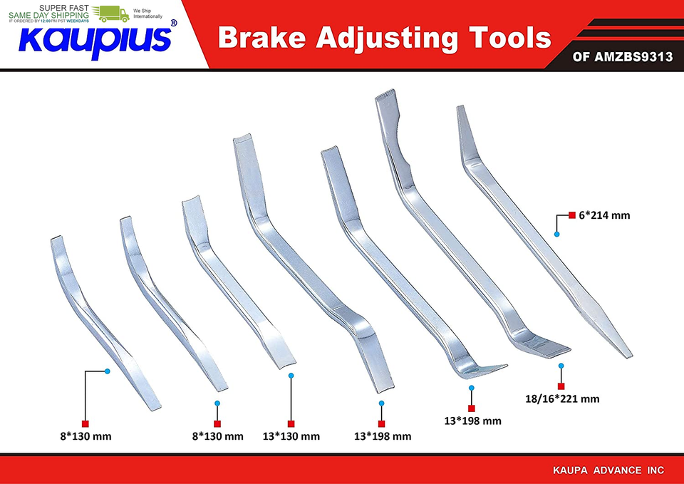 The Kaupa 14-Piece Professional Drum Brake Service Kit is idea for servicing drum brakes on most of import and domestic vehicles adjustment, installation and removal application, The Kaupa Brake repair tool set contains: 4 different Brake Spring tool: (1) spring compressor + (1) brake spring installer + (1) spring removal tool + (1) brake retaining spring tool, with anti slip TPR grip, and the tri-function Brake spring pliers removes and replaces shoe return springs of drum brakes effectively and 7 different Drop Forged Steel Brake Spoons for adjusts Brake Shoe between Brake Drum, adjuster type brakes easily adjusting most brake drums, and a Mini Brake Adjustment Spoon.14 pcs Brake Service Kit all the contains are Made in Taiwan, comes in an organizer tray, with Brake Lining Gauge, identifies thickness level ranges for brake lining inspection to be used on most foreign and domestic cars and trucks.