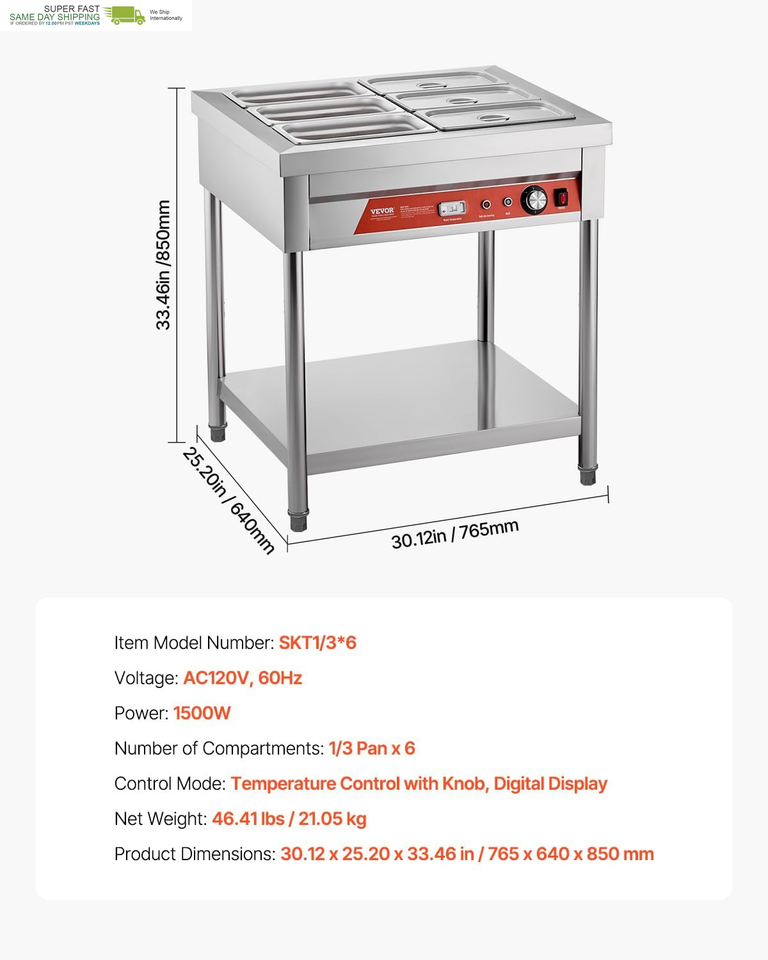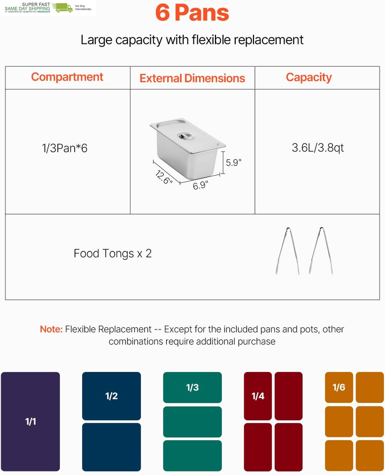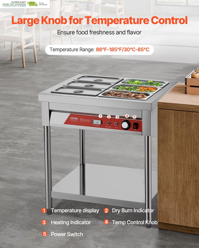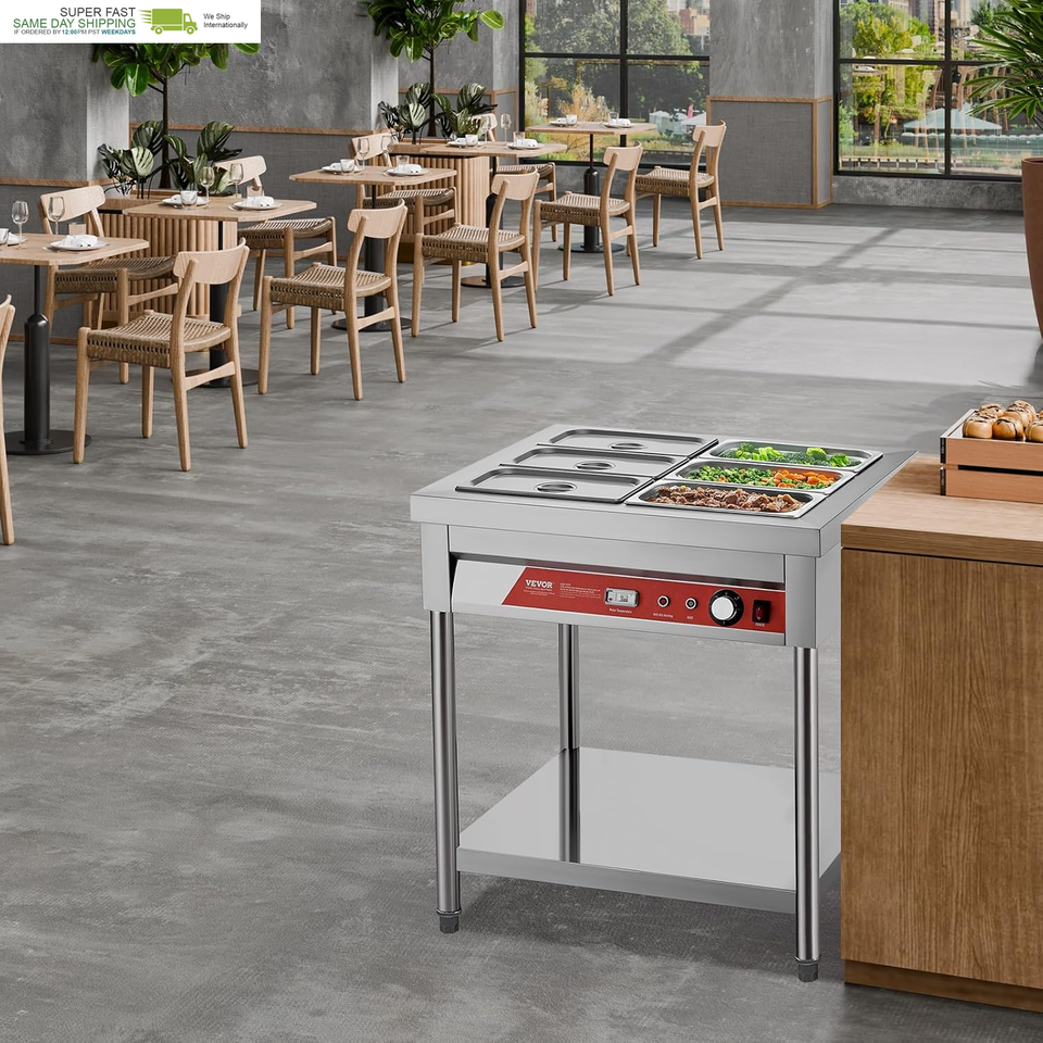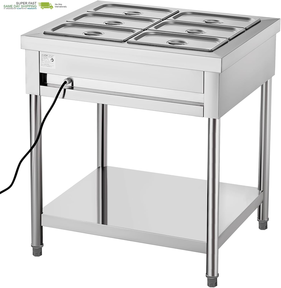 Commercial-Grade Large Capacity: With six 1/3-size pans, our steam table is designed for a variety of dining needs. Our standardized machine dimensions are compatible with all pans up to 5.9 inch in depth