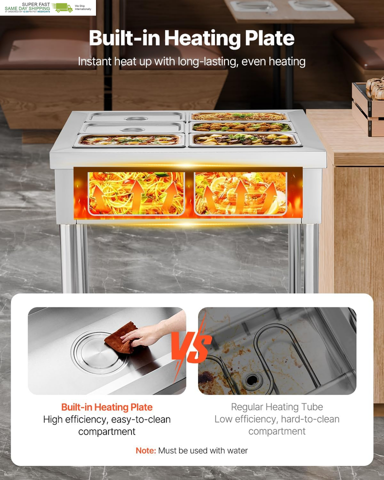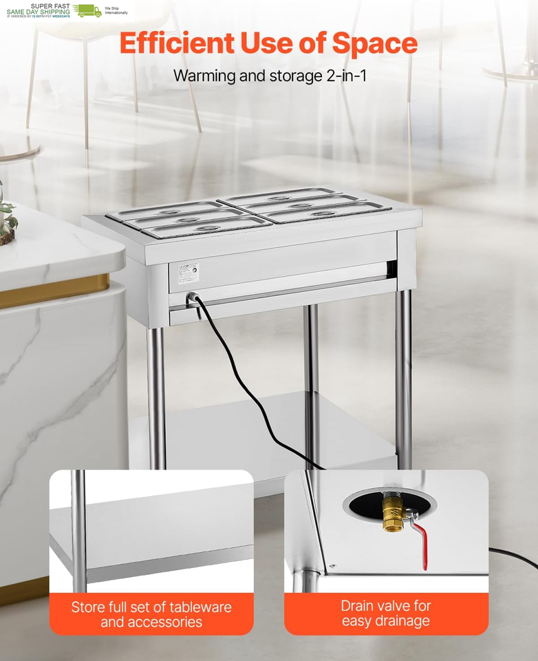 Thoughtful Details:The large undershelf is perfect for storing extra tableware and utensils. With a 1.8m power cord and main power switch design, it eliminates distance limitations to outlets. Widely used in cafeterias, hotels, fast food restaurants, supermarkets, and more