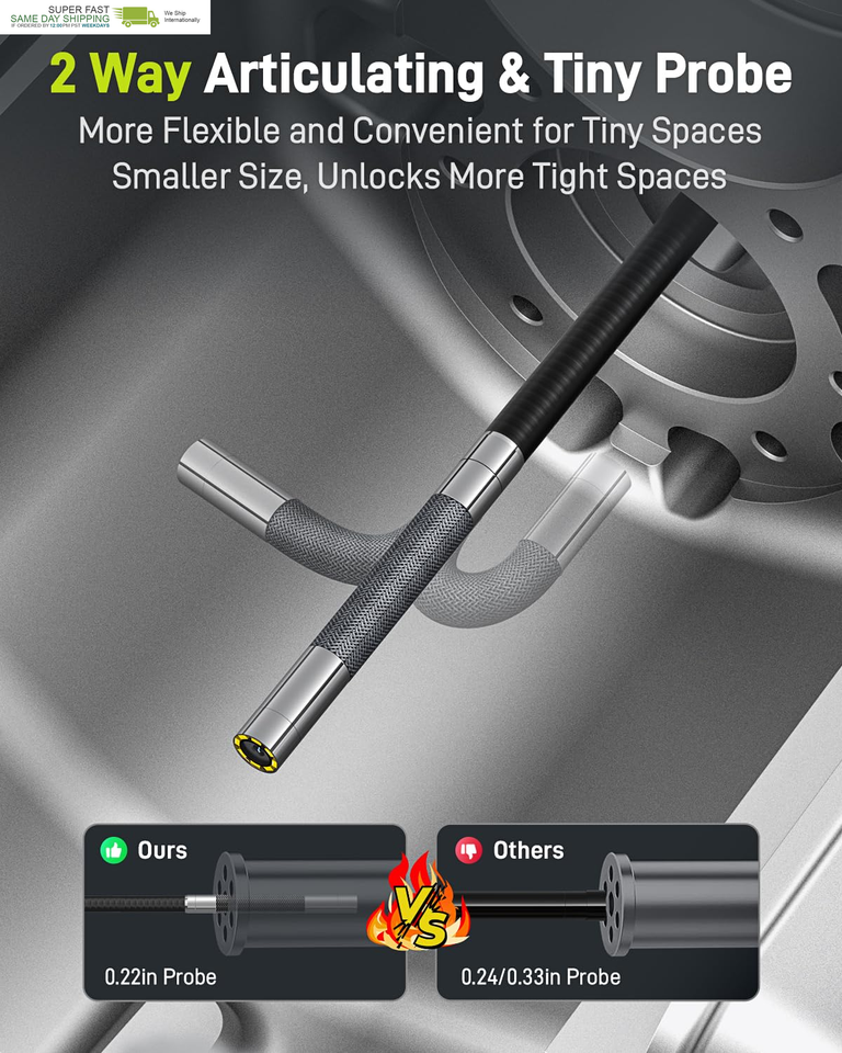 The dual-direction 210 articulation allows you to precisely bend the camera tip left and right, helping you inspect tight corners, behind objects, and inside hard-to-reach areas that regular borescopes can?t reach.