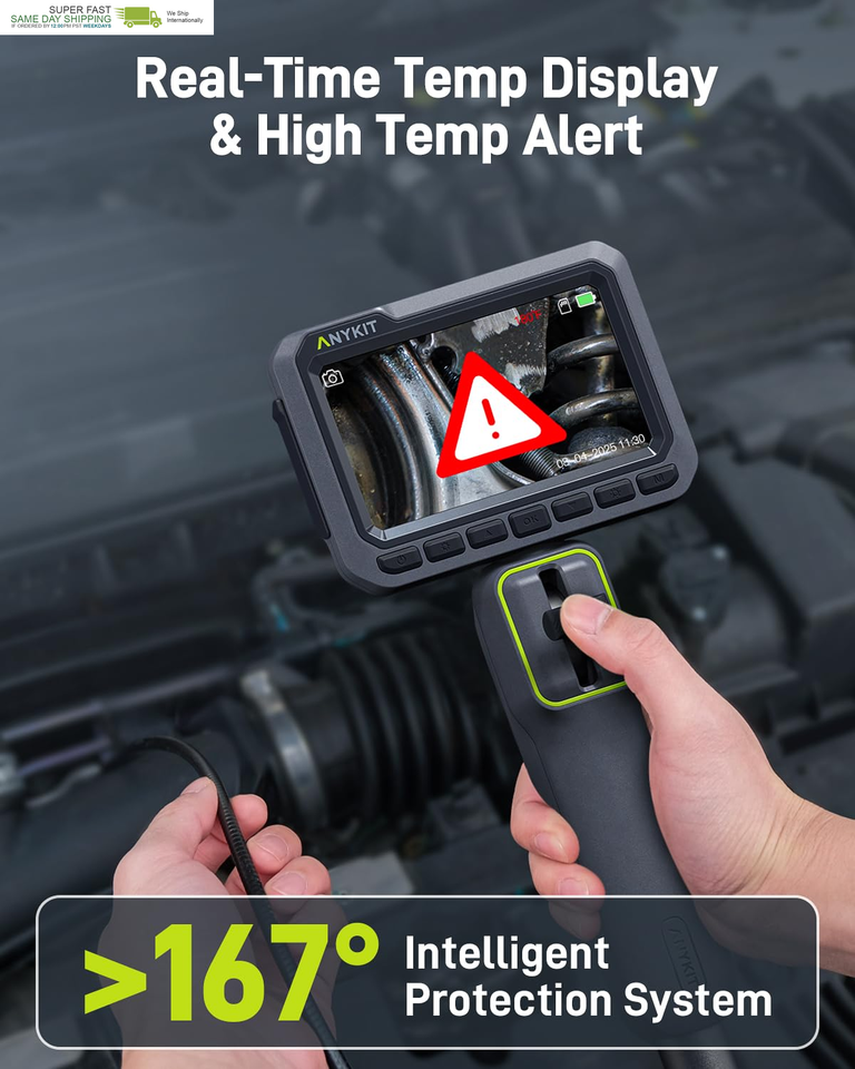 ?Built-in Overheat Alarm?Equipped with a smart temperature sensor, this inspection camera automatically displays a dedicated red icon alert on the screen in high-temperature environments like automotive exhausts or industrial machinery. This feature protects your equipment, ensuring durable performance and safe operation.