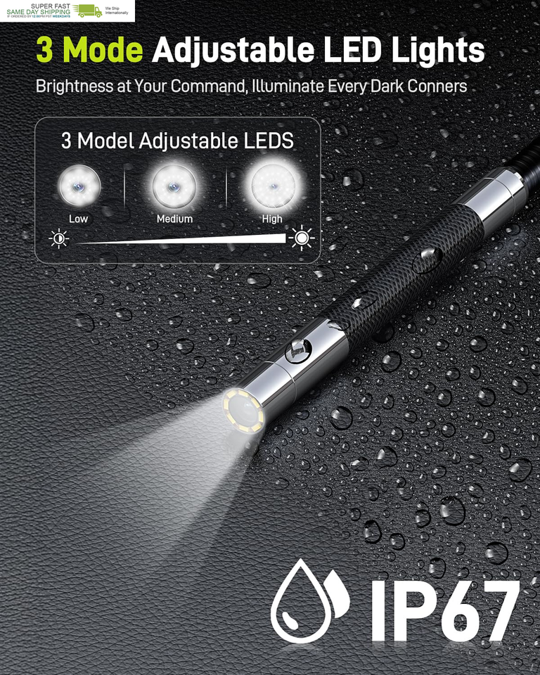 The camera is equipped with 8 ultra-bright LEDs with adjustable brightness, giving you clear visibility even in completely dark or low-light environments like inside walls or engine bays.