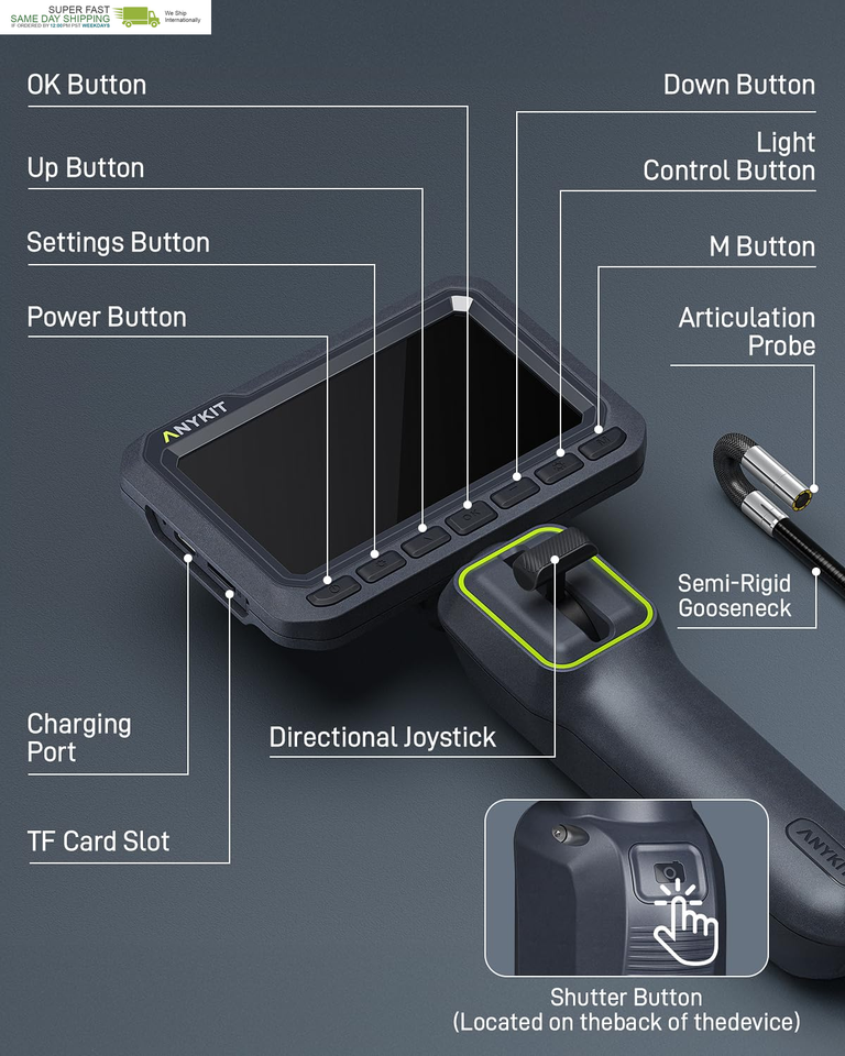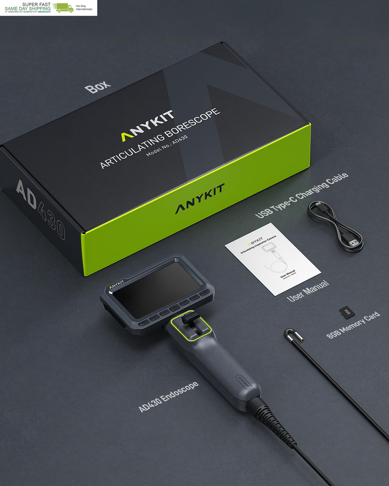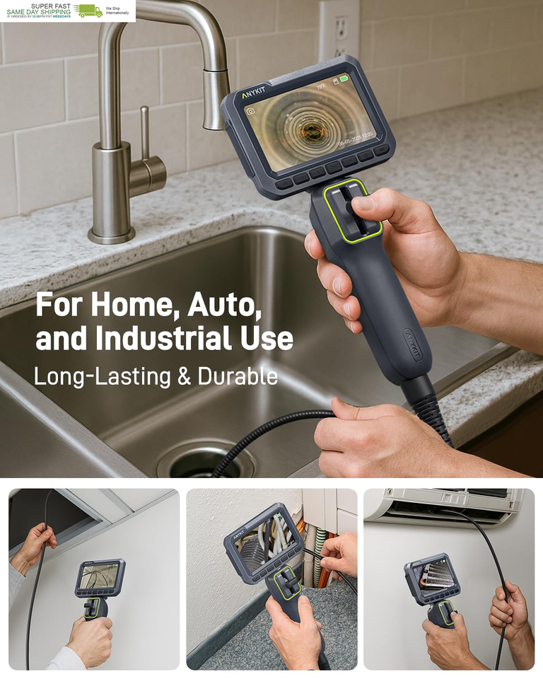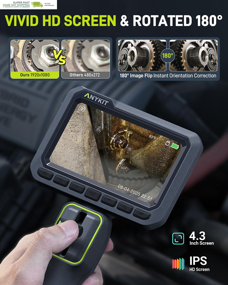 ?4.3" IPS Screen 180 Image Flip?Anykit 1920P HD Inspection Borescope ? your all-in-one tool for precision diagnostics. The 1920x1080P camera and high-brightness adjustable LED lights deliver crystal-clear visuals in the dark. With 3-level zooms and 180 image flip for instant orientation correction. A semi-rigid 4ft cable holds its shape, providing a stable, close-up view on the large screen.