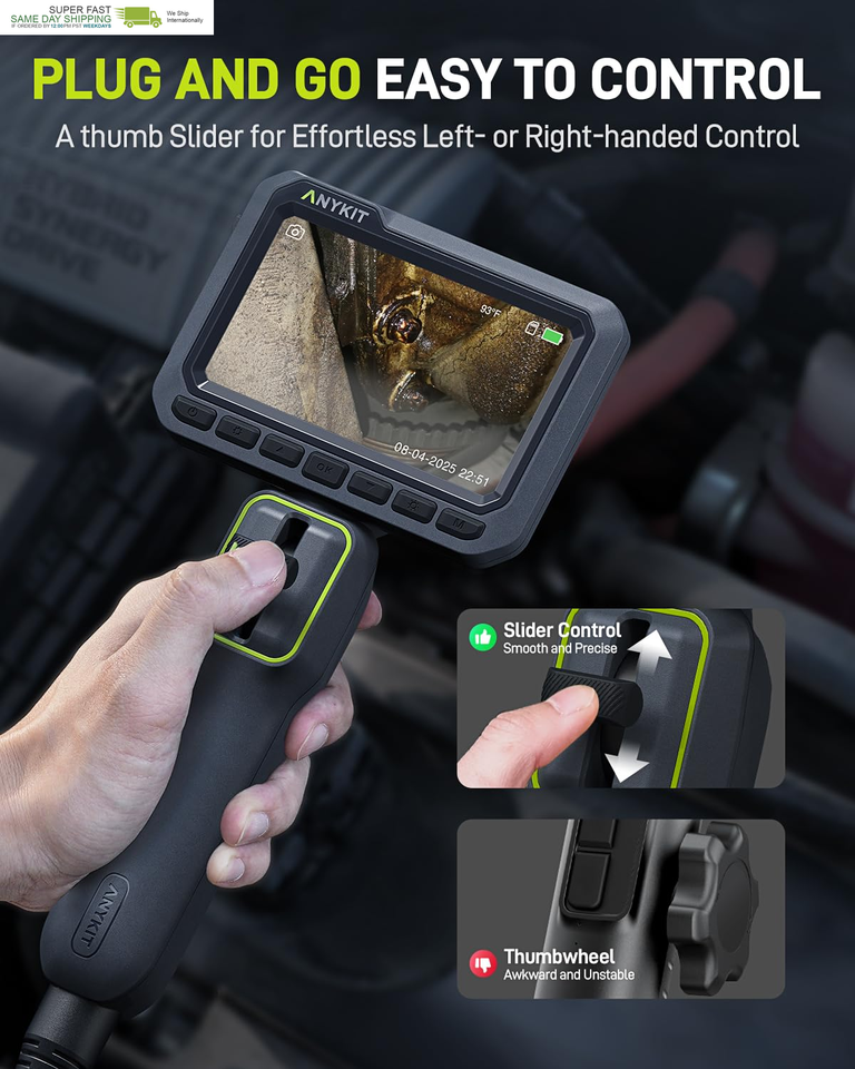 ?Handy Easy to Control?Plug and play endoscope design for you! This handheld inspection camera requires no phone or app, featuring a thumb-slider for easy, ambidextrous articulation. The IP67 waterproof and durable design is ideal for automotive, plumbing, and industrial diagnostics in harsh environments.