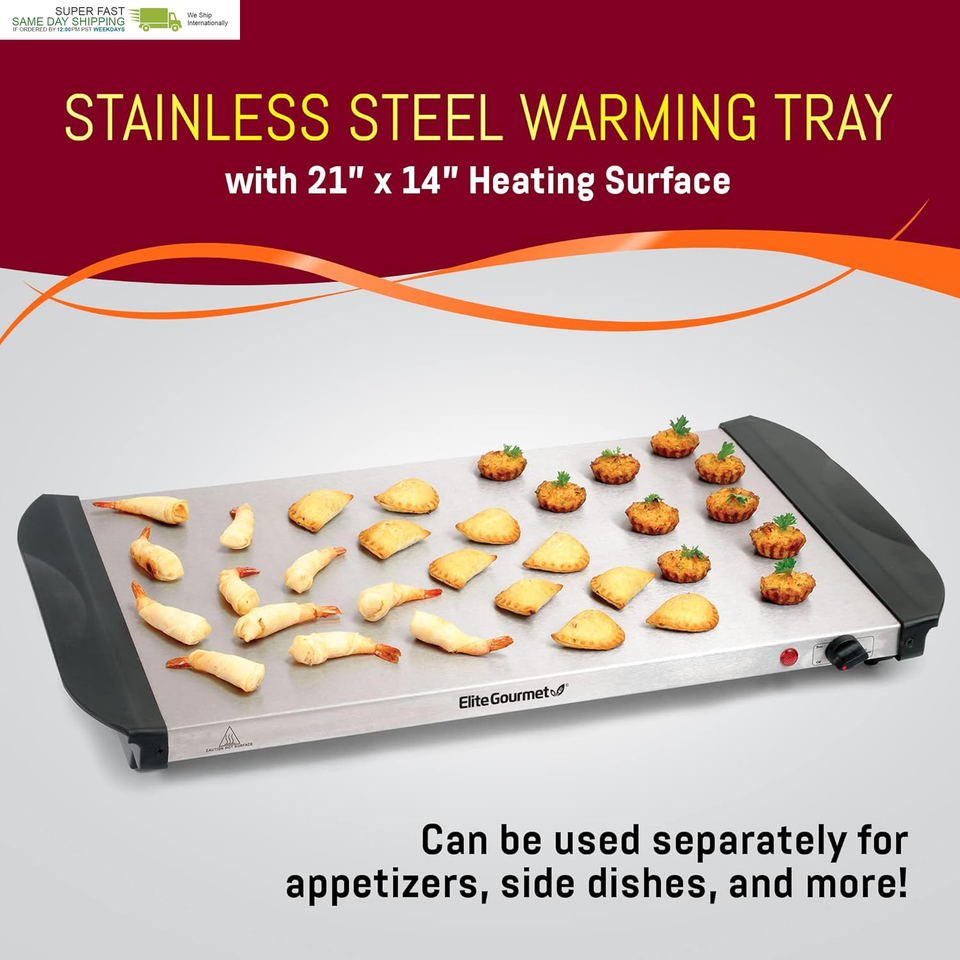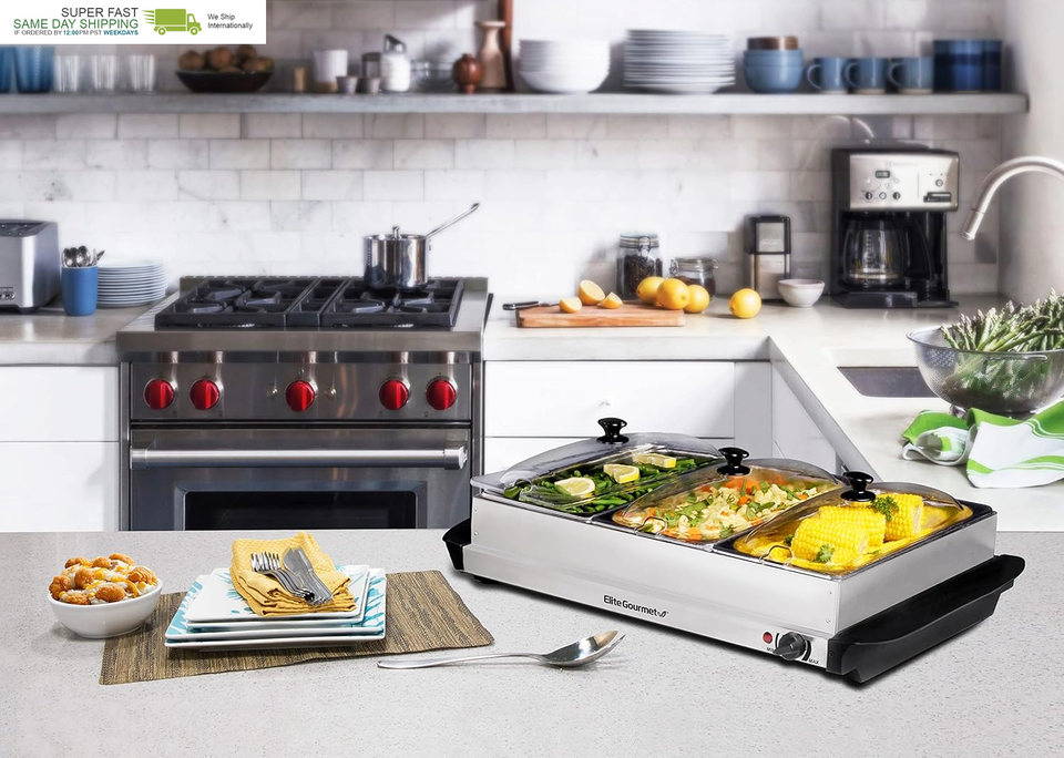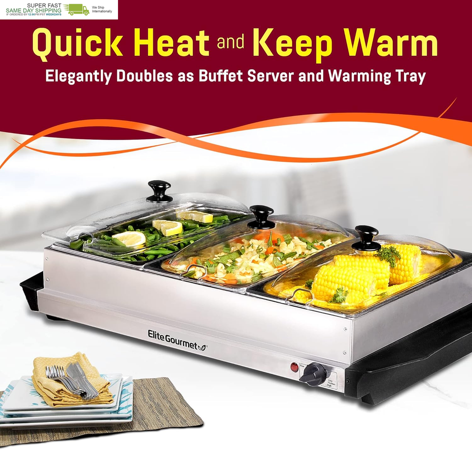 Keep the party going all day and all night with the Stainless Steel Buffet Server and Warming Tray by Elite Gourmet. The specially designed buffet server is equipped with a total of three brushed stainless steel 2.5 quart buffet trays. You can also choose to not use the included pans and use your own dinnerware or foil pans by setting them directly on the flat 21-inch by 14-inch warming tray. You can keep food warm for hours at all your social gatherings without using an open flame or warming water. Serve cheesy garlic mashed potatoes, hot gravy and tender turkey breasts all at the same time. Each 2.5 Quart pan has its own BPA-Free clear dome lids with built-in slot for serving utensils. Featuring Low, Medium and High temperature settings, you can easily adjust to keep food piping hot and ready for serving, or set to low while guests mingle. The sleek stainless-steel design making it easy to clean and dishwasher safe