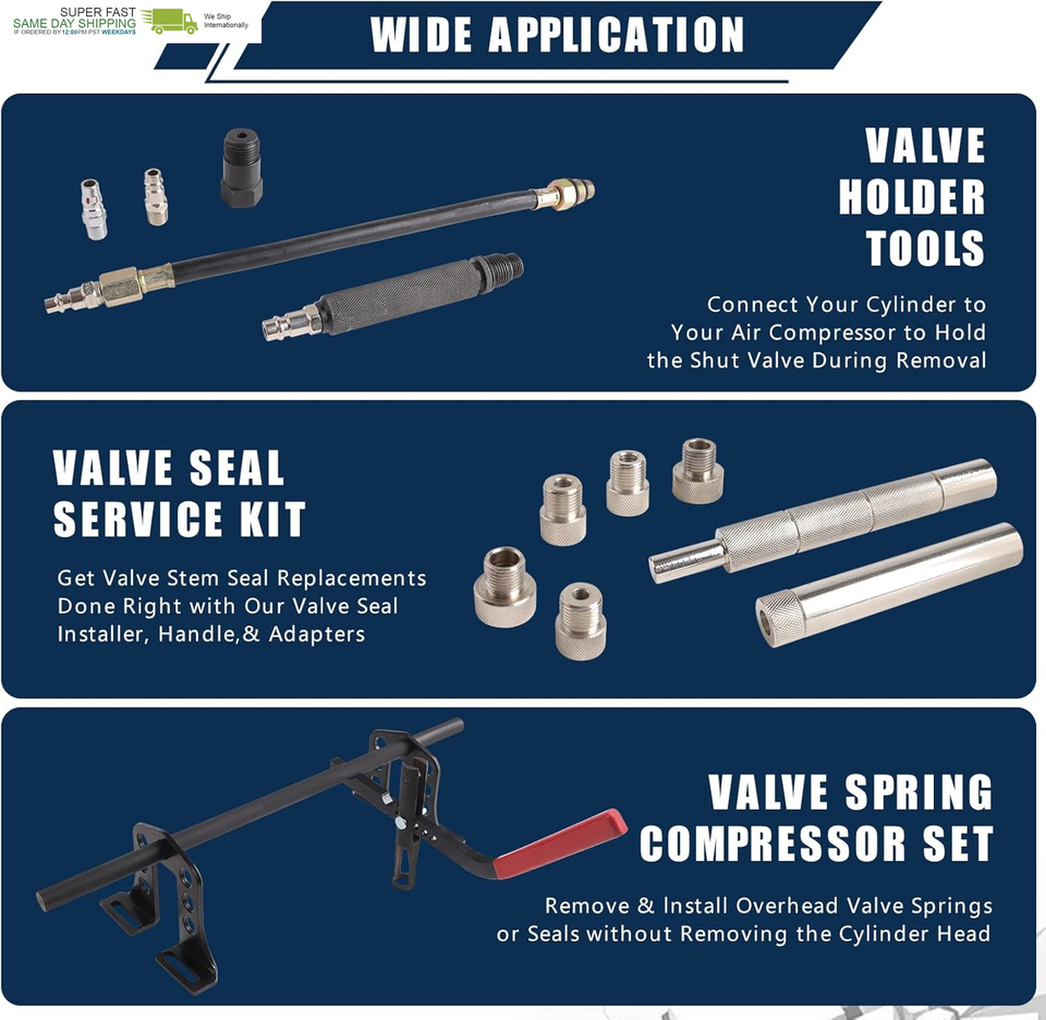Perfect for remove and install the valve spring with the cylinder head on or off the OHV and OHC petrol or diesel engines, and remove the valve stem seals on overhead camshaft engines.