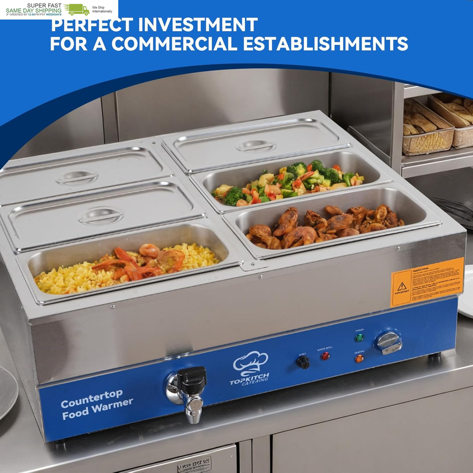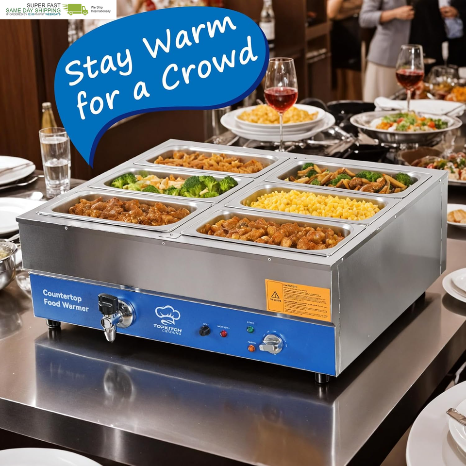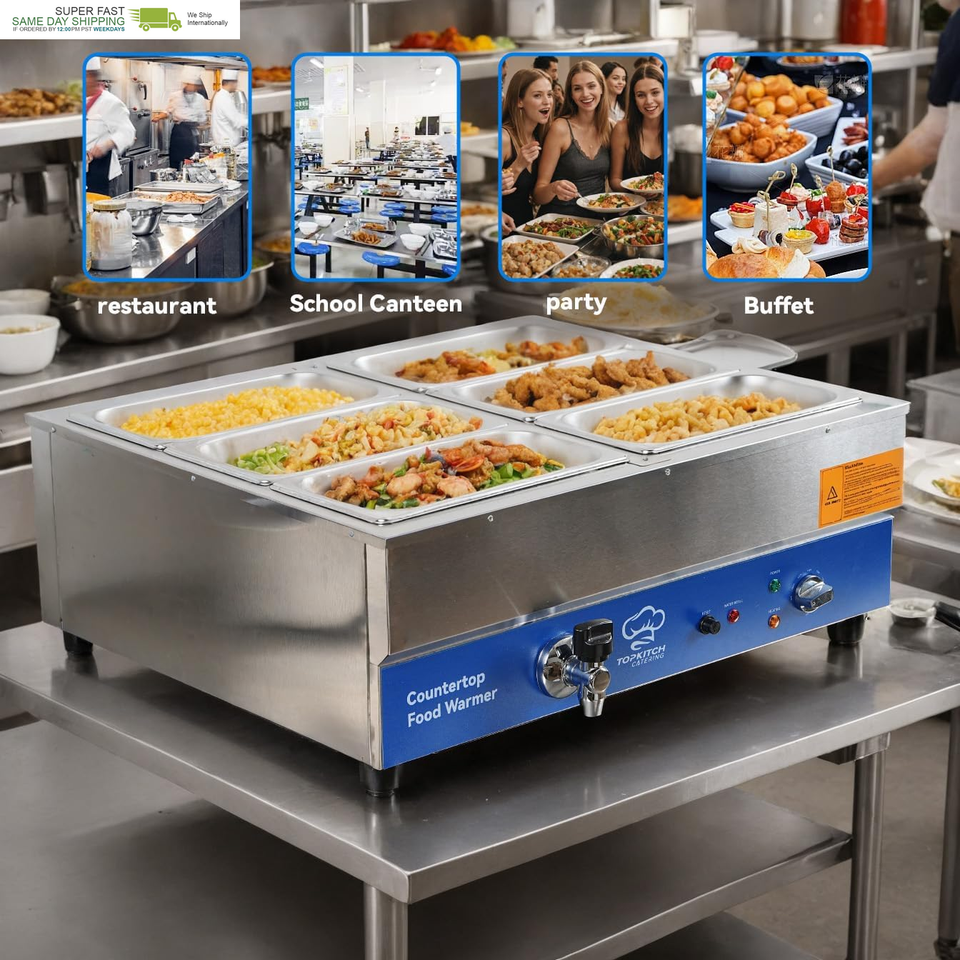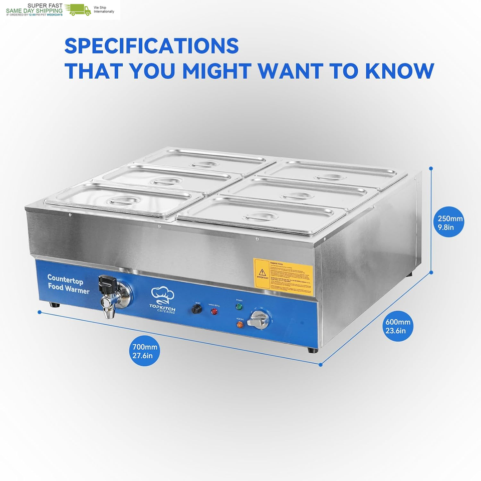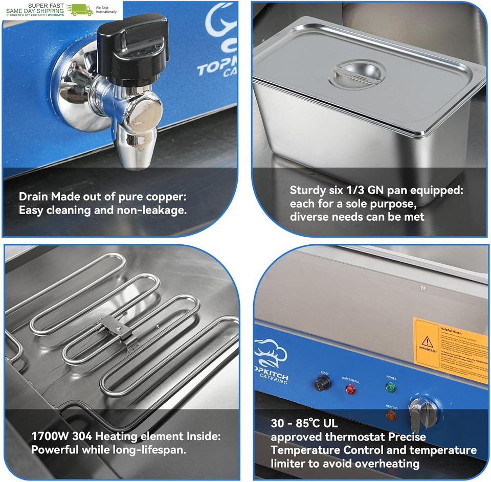SIX 1/3 Size GN pan for Diversity,48Qt Large capacity:store up to 6 different types of food without flavour mixed,ideal for various catering or partying scenarios 30 - 85??85?~185?) Precise Temperature Control,always keep your food at optimal temperature Pure Copper Faucet equipped,A single push to rotate and let the drain do its magic 304 Heating Tubes for Durability and Efficiency,powerful 1700W heats up in no time,elevate your food warmer experience to another level 0.8mm compact Stainless Steel Body for Robustness,able to withstand the rigors of daily use UL Approved thermostats,temperature limiter,power cords for safety usage and avoid overheating