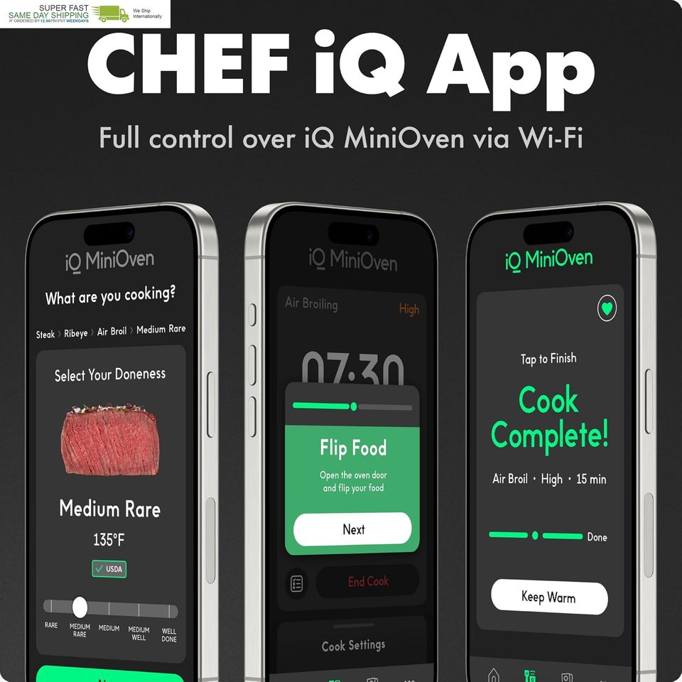 PAIRS WITH IQ SENSE: The MiniOven is fully compatible with the iQ Sense Smart Cooking Thermometer, adapting your toaster oven on the fly for perfect results, inside and out.