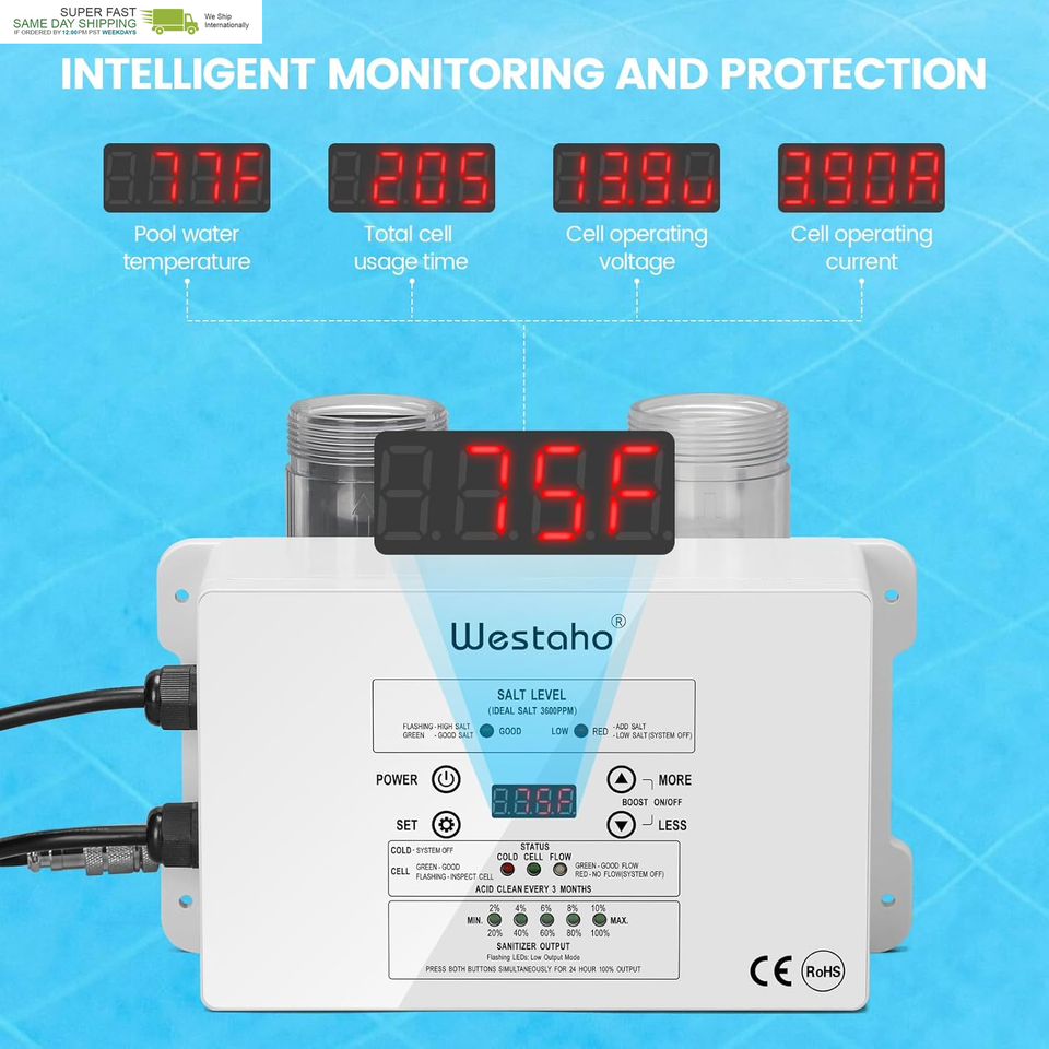 INTELLIGENT MONITORING PROTECTION SYSTEM: The Westaho salt pool system comes equipped with an advanced control panel that provides real-time data on salt levels, pool temperature, cell usage, voltage, and current. It includes built-in low water temperature protection, automatically shutting down if the water temperature drops below 52F to preserve the lifespan of the cells and maintain optimal pool health