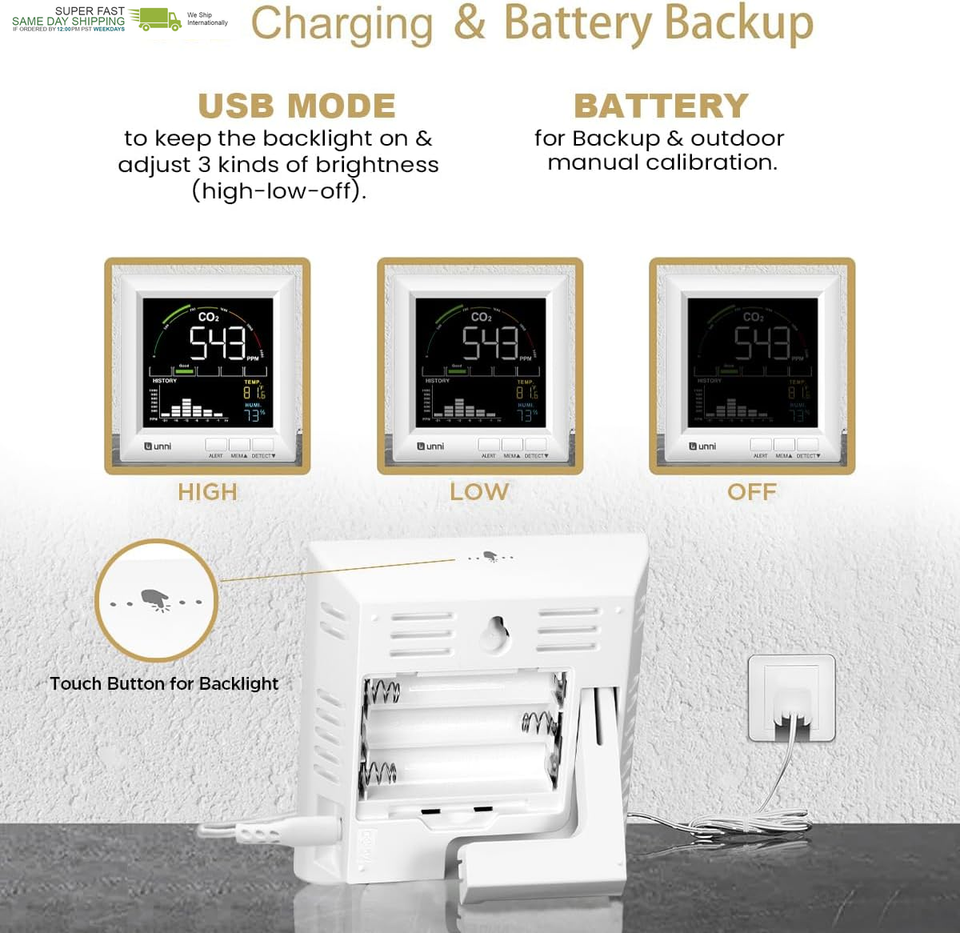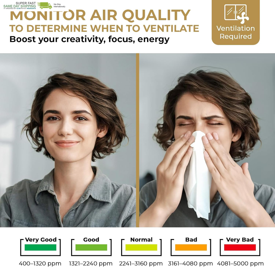 INDOOR AIR QUALITY MONITOR - Detect rise and decrease in carbon dioxide level, perfect for anyone wanting to monitor air quality! Elevated CO2 can cause symptoms like headaches, drowsiness, allergies and difficulty concentrating, to keep an eye on air quality at home or work!