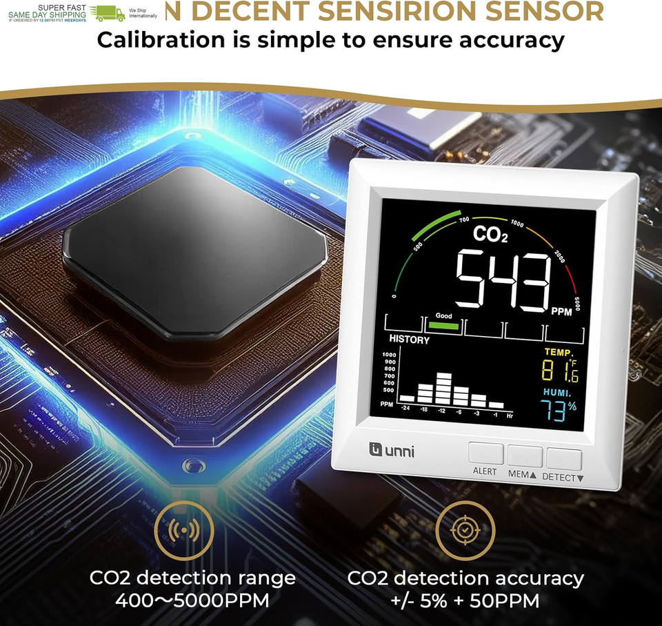 HIGH-PRECISION SENSIRION CO2 SENSOR ? Equipped with Swiss-made Photoacoustic Sensor provides precise and reliable readings, which gives you peace of mind about the air in your home. CO2 detection range: 400?5000PPM,accuracy: +/- 5% + 50PPM. Temperature range: 14.2F ~ 122F, Humidity range: 20% to 95 %.