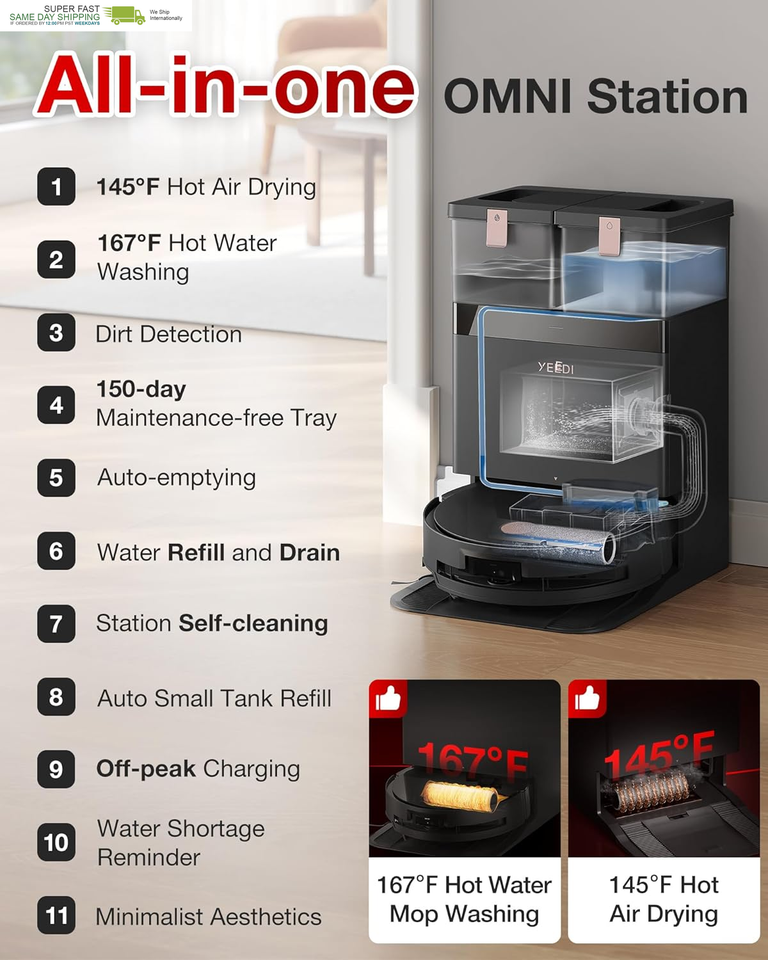 ?OMNI Smart Station?Cleaning Maintenance Made Effortless - Let the OMNI Station handle the hard work: it washes your mop with steaming 167? water, dries it at 145?, empties dust automatically, and refills water?so you can spend less time cleaning and more time living, with all maintenance visible and simple.