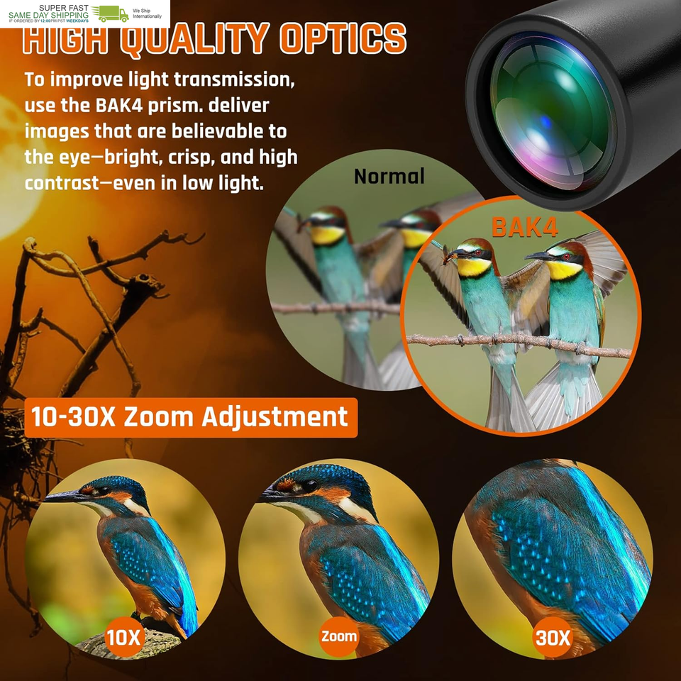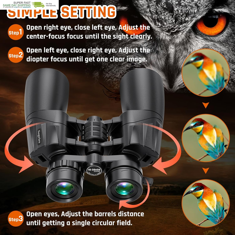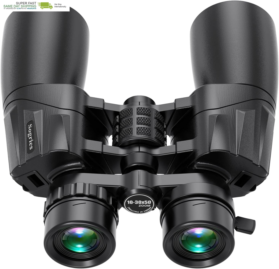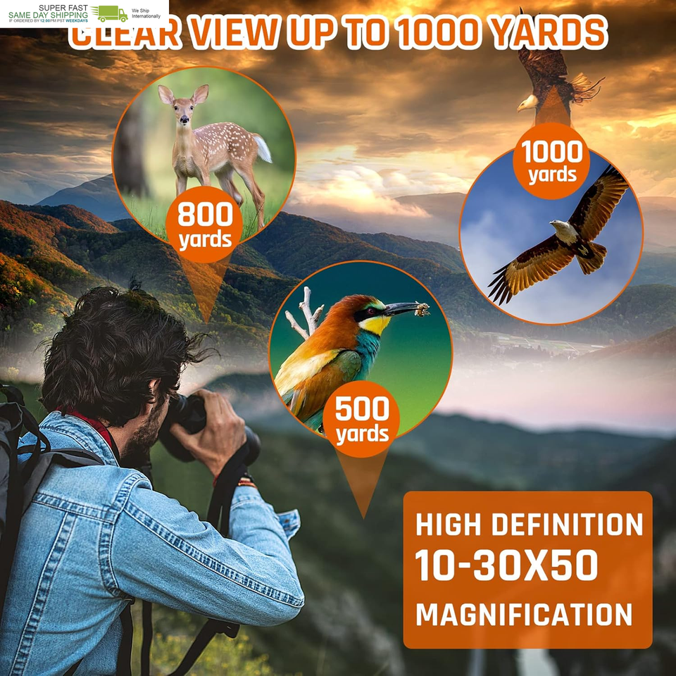 High Power Zoom Binoculars--Professional 10-30x50 zoom binoculars with a 50mm big eyepiece and 10-30X magnification let you focus on the target for excellent details from 235 feet or 1000 yards away. the powerful binoculars provide a bright, sharp, and vibrant image with more true-to-life details, making them ideal for driving, and wildlife and scenic viewing. It works well for large-scale theatre productions, concerts, football games, etc.