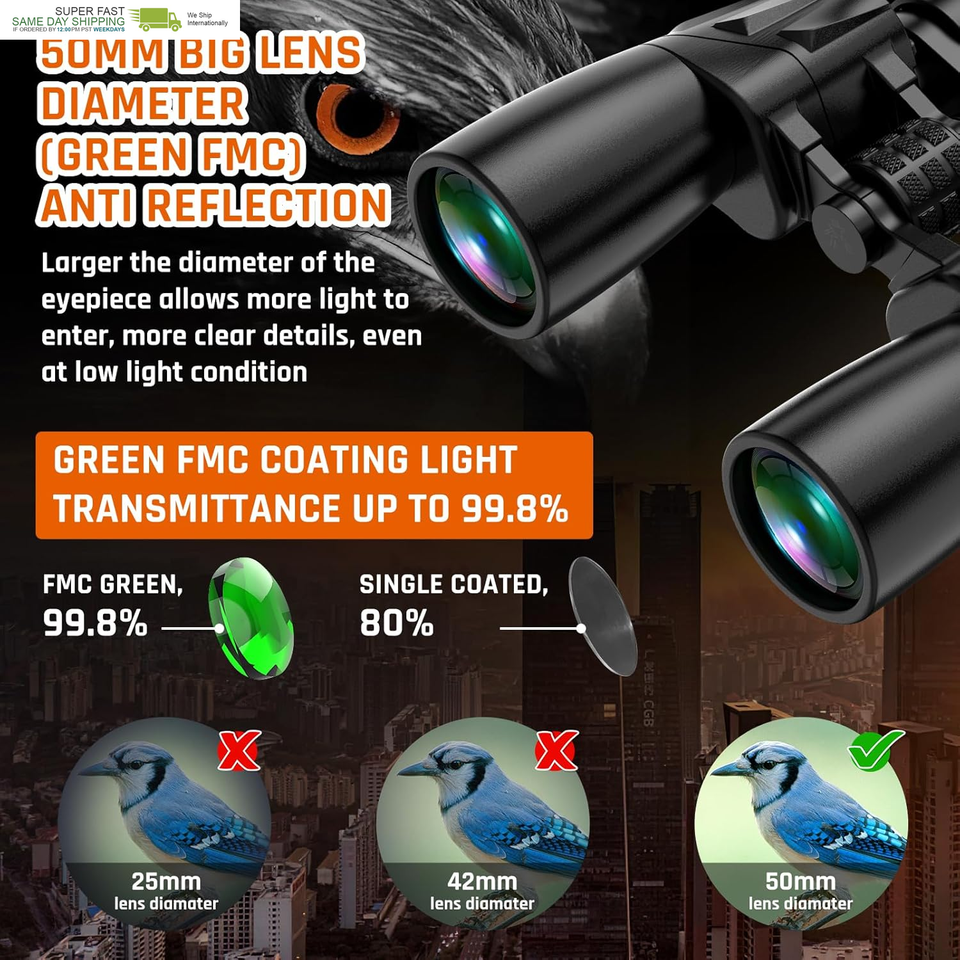 HD High-Contrast Images--The BAK-4 prisms and FMC multi-coated broadband green film in these bird watching binoculars produce crisp images, accomplish correct colour reproduction, and have a light transmittance of up to 99.5%. These features also help to prevent glare and protect our eyes. The zoom binoculars offer brighter eyesight in low-light situations like twilight but not for completely black nights. Clear low-light vision.