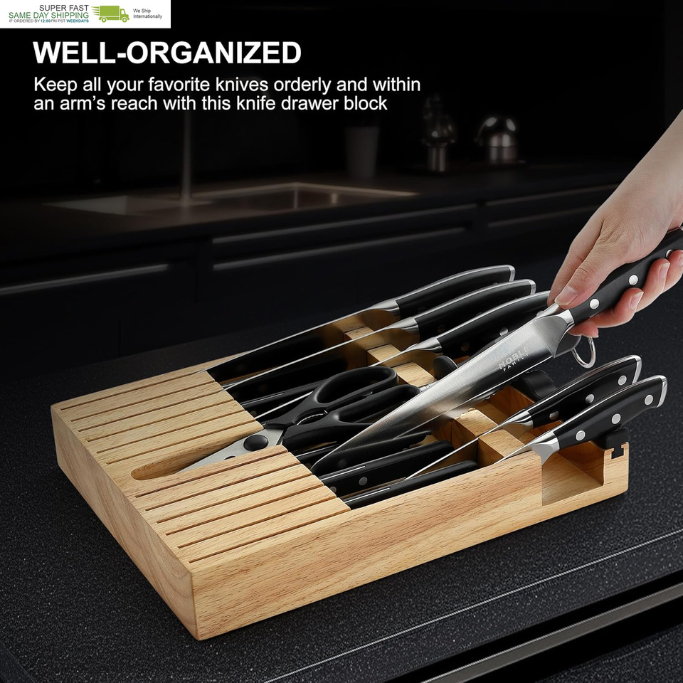 Easy Storage Maintenance: All kitchen knives are well stored in the In-Drawer Wooden Knife Block, which helps to keep the blades sharp. Dishwasher is not recommended, hand wash and air dry to store for better care and longevity. If you have children, this chef's knife set with drawer knife block is safer than other knives set.
