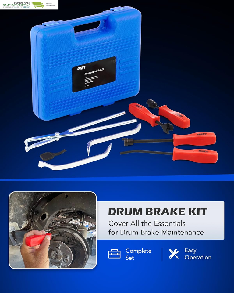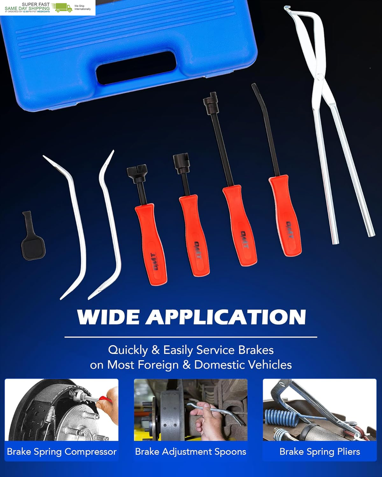 This professional brake service tool kit includes all the essential tools you need to let you easily replace worn springs, check brake pads, and inspect other parts of your drum brake system.