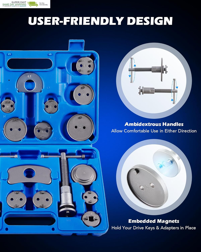 Designed to fit almost all vehicles, this complete brake tool kit provides superior performance and dependable quality, letting you rotate pistons back into their calipers without causing damage or scratches.