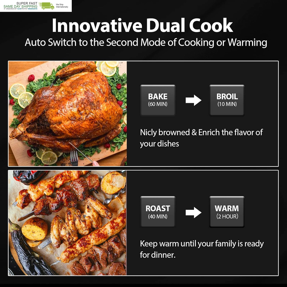 ? 19+N Presets for Your Endless Inspiration? One machine to fulfill air fry, bake, roast, broil, rotisserie, toast, dehydrate, defrost, warm, proof, and so on. The innovative dual cook function enables you to combine any two functions in preset. Make Complex recipes effortless and rich the dish's flavor.