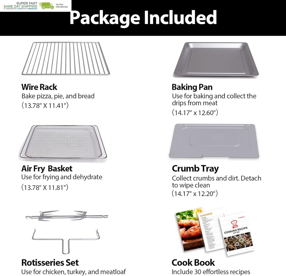 ?Cookbook 6 Accessories ? Come with a cookbook including 30 effortless recipes. All accessories are detachable and dishwasher safe. Including fry basket, oven rack, baking pan, rotisserie spit fork, rotisserie lift, and crumb tray.